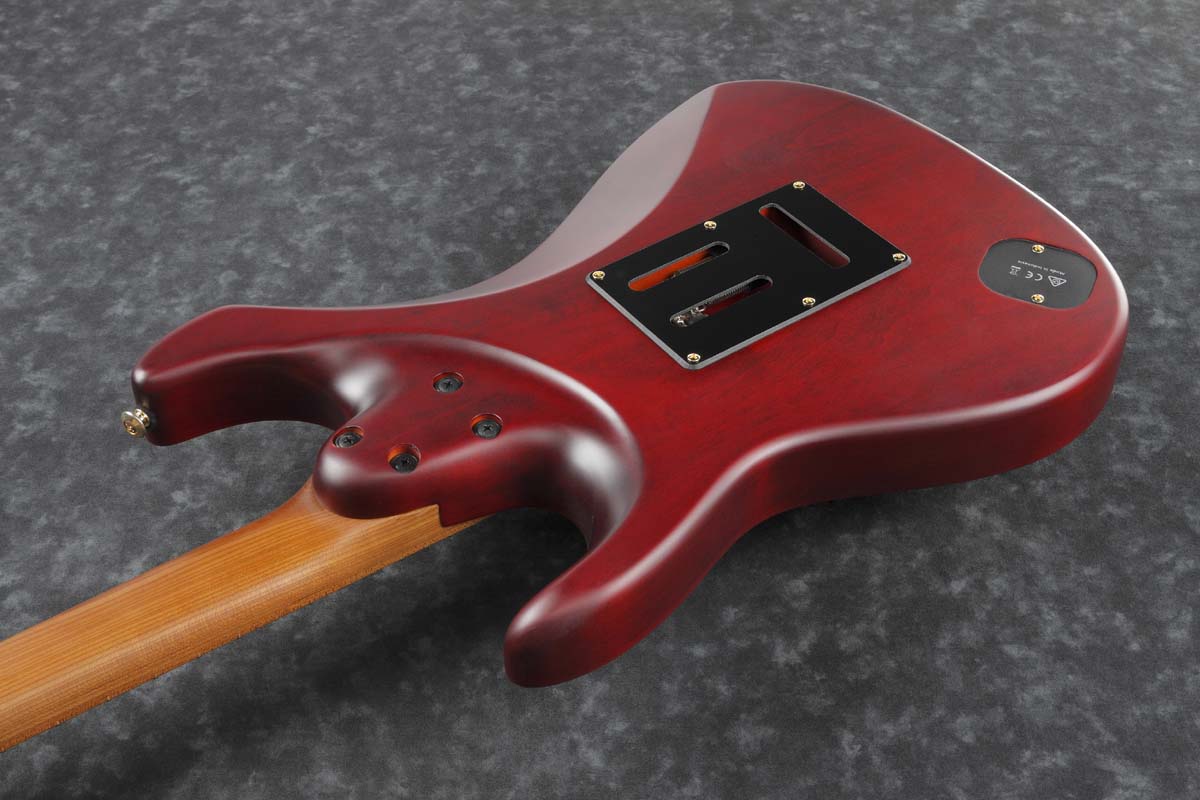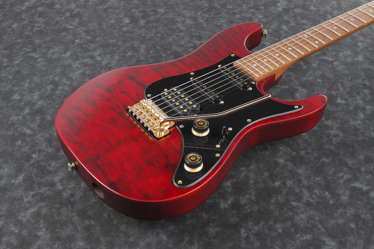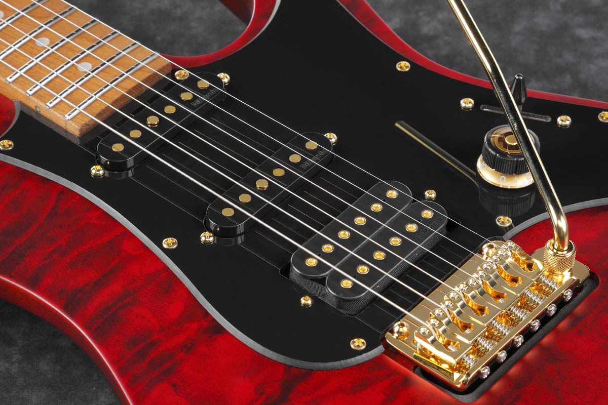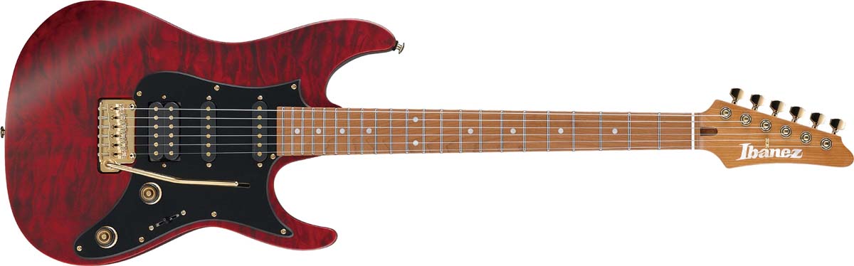 Other useful features include a Graph Tech® nut, T1502 by Gotoh® tremolo bridge, and Gotoh® MG-T locking machine heads. The guitar imparts a modern but mature look thanks to its Quilted Maple top, gold hardware, and Transparent Red Matte Finish.