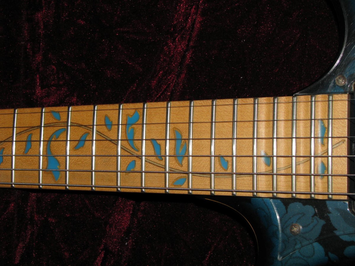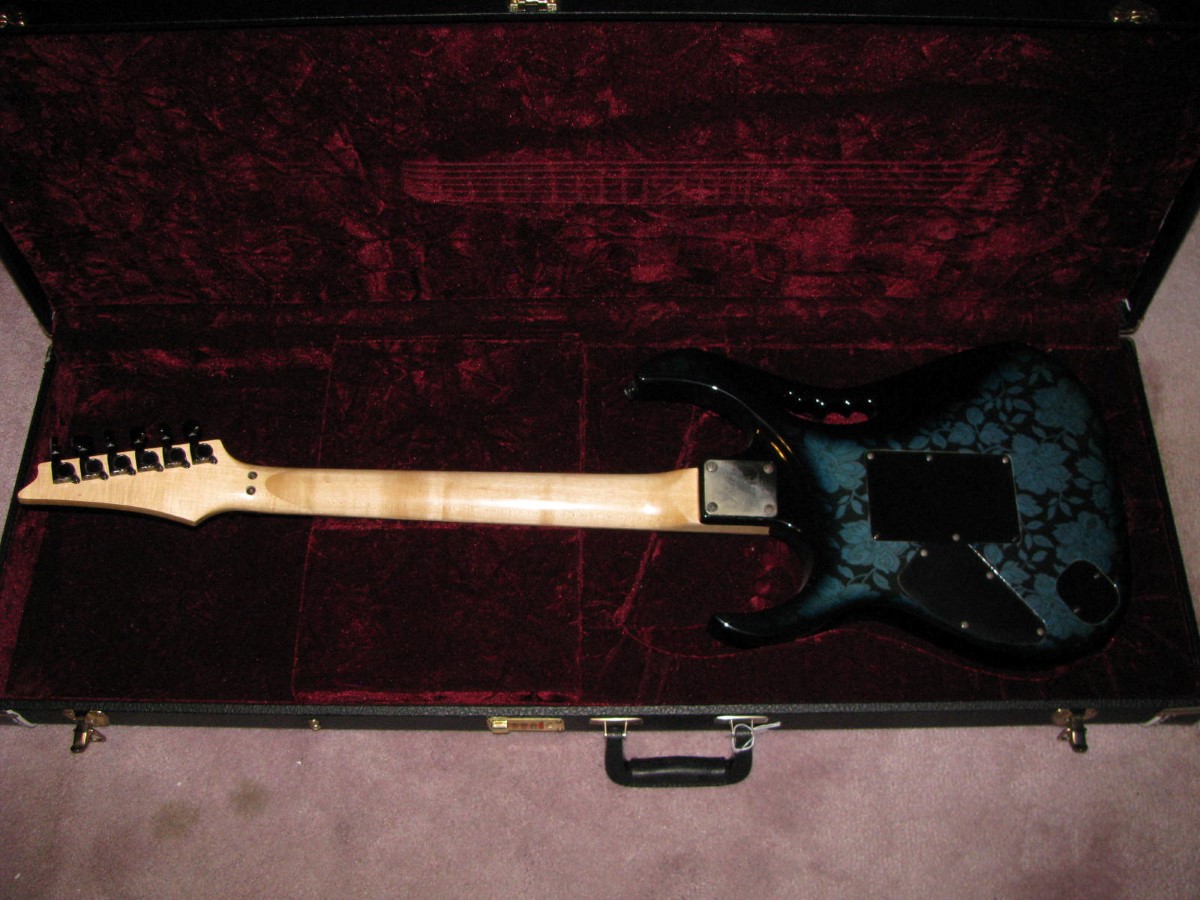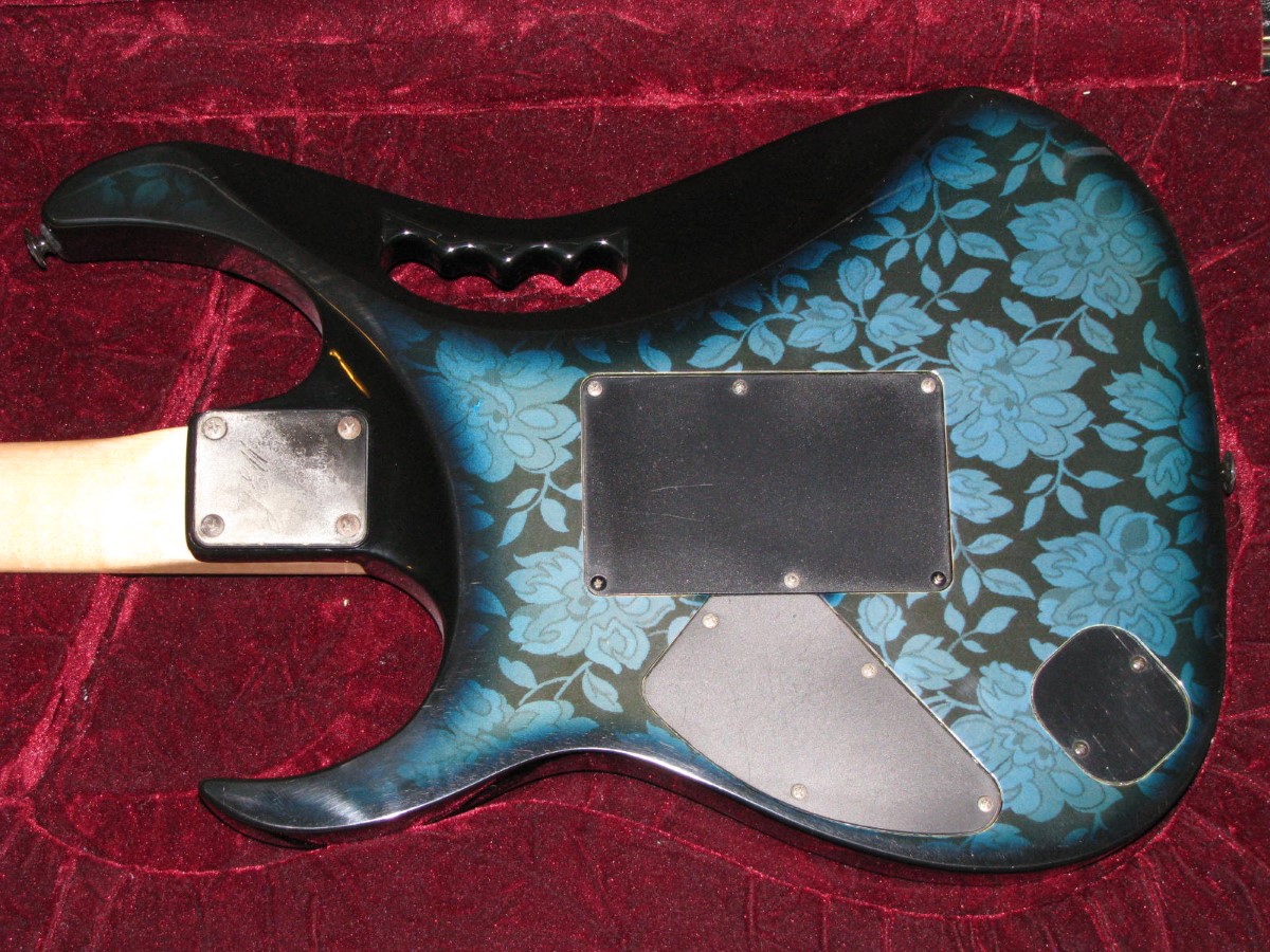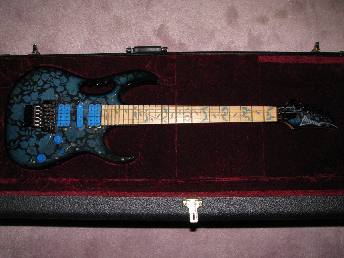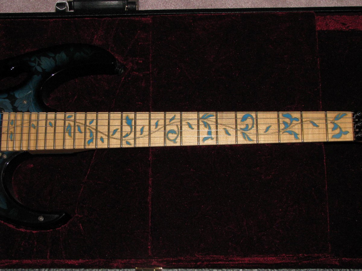 JEM77BFP - EXC, This BFP is rare in that it's still very much blue as the clear hasn't yellowed, which has given most of these green hues. It has been played so is showing lighter pick and fingernail scratching to the pickguard and wear to the top edge of the volume knob, the painted blue wearing thru to the white knob underneath which is common on played BFP's. There is a fine scratch cloudy area on the top trem corner of the pickguard and into the paint above probably from a bracelet, none of the scratching is deel and all very fine. There is a ding on the front bottom edge, and the bottom side has several scratches and finish cracks, with a scuff on the top front side edge at the arm contour. There are a few small fog spots in the middle of the back and several small marks and scratches scattered. The jack cover is a non original replacement and is like the trem cover from the DY, which probably actually goes on this guitar. The trem has some fine pimpling to the baseplate and a little cosmo wear off the high points of the low E saddle and small spot corrosion to the tops of the rest, the neck plate with crusty white corrosion and about 25% original finish. There is a little dirt in the fretboard and it has very mild and even fretwear. The headstock is very clean. The back of the neck has been cleaned and clearcoated and all the orange peel wetsanded down and polished, probably to somebody's preference, and is super slick as it is. It does have an S shape neck bass side so it will need a deep fret level to make this guitar into a good playing guitar. It's in a basically brand new 2000's burgundy lined UV1000 case with bar only.**$2200** **REDUCED!! $1850**