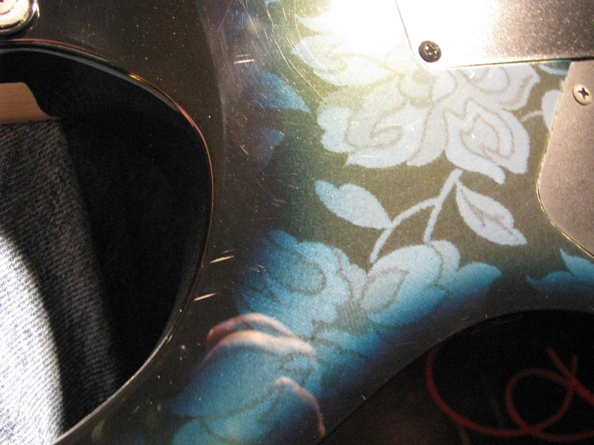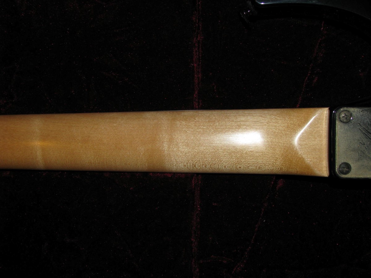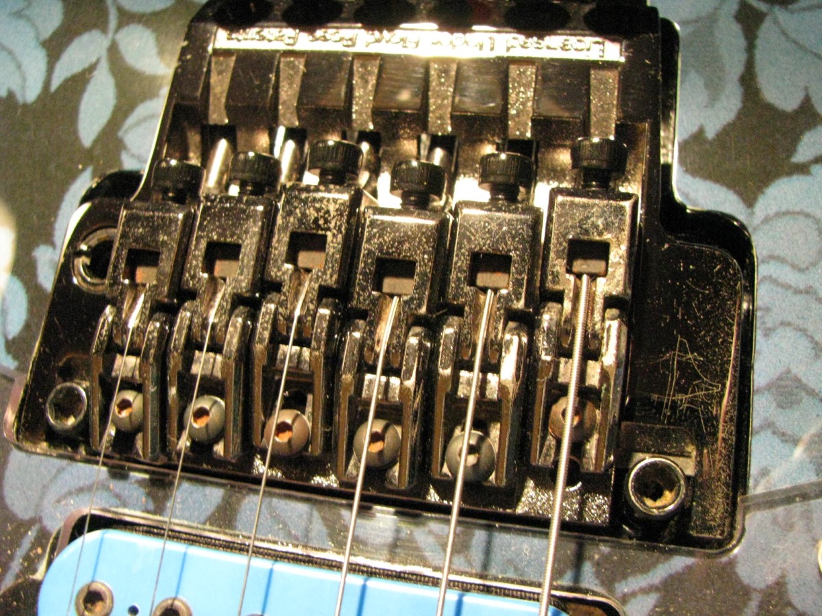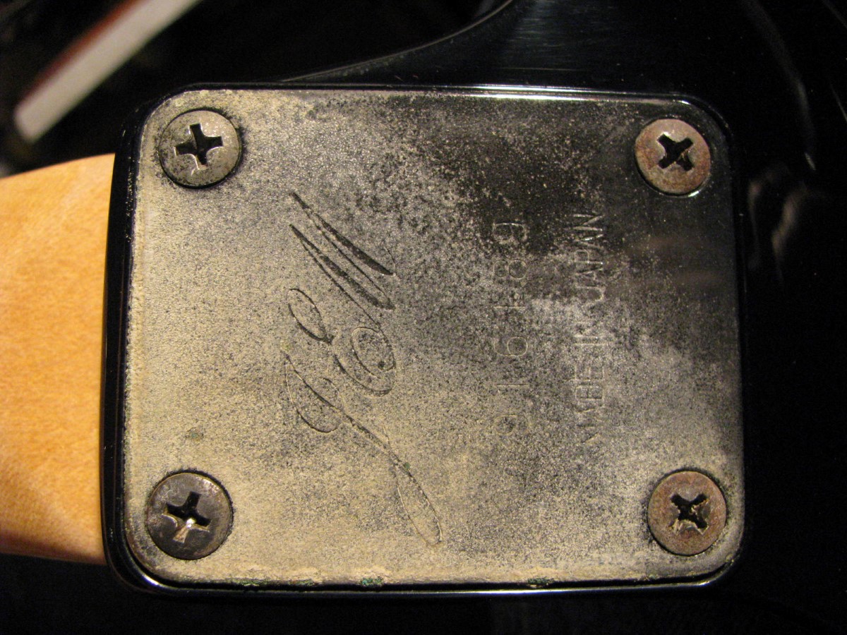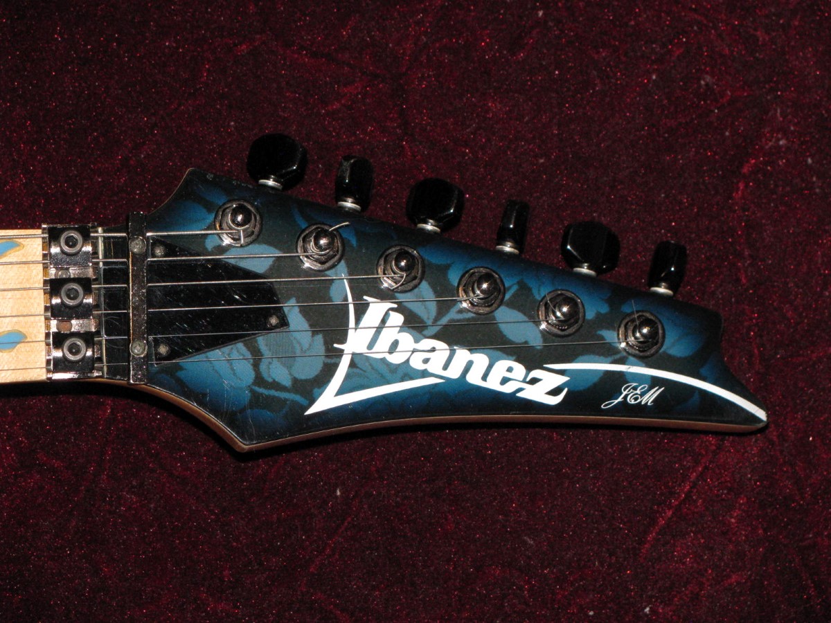 JEM77BFP - EXC, This BFP is rare in that it's still very much blue as the clear hasn't yellowed, which has given most of these green hues. It has been played so is showing lighter pick and fingernail scratching to the pickguard and wear to the top edge of the volume knob, the painted blue wearing thru to the white knob underneath which is common on played BFP's. There is a fine scratch cloudy area on the top trem corner of the pickguard and into the paint above probably from a bracelet, none of the scratching is deel and all very fine. There is a ding on the front bottom edge, and the bottom side has several scratches and finish cracks, with a scuff on the top front side edge at the arm contour. There are a few small fog spots in the middle of the back and several small marks and scratches scattered. The jack cover is a non original replacement and is like the trem cover from the DY, which probably actually goes on this guitar. The trem has some fine pimpling to the baseplate and a little cosmo wear off the high points of the low E saddle and small spot corrosion to the tops of the rest, the neck plate with crusty white corrosion and about 25% original finish. There is a little dirt in the fretboard and it has very mild and even fretwear. The headstock is very clean. The back of the neck has been cleaned and clearcoated and all the orange peel wetsanded down and polished, probably to somebody's preference, and is super slick as it is. It does have an S shape neck bass side so it will need a deep fret level to make this guitar into a good playing guitar. It's in a basically brand new 2000's burgundy lined UV1000 case with bar only.**$2200** **REDUCED!! $1850**