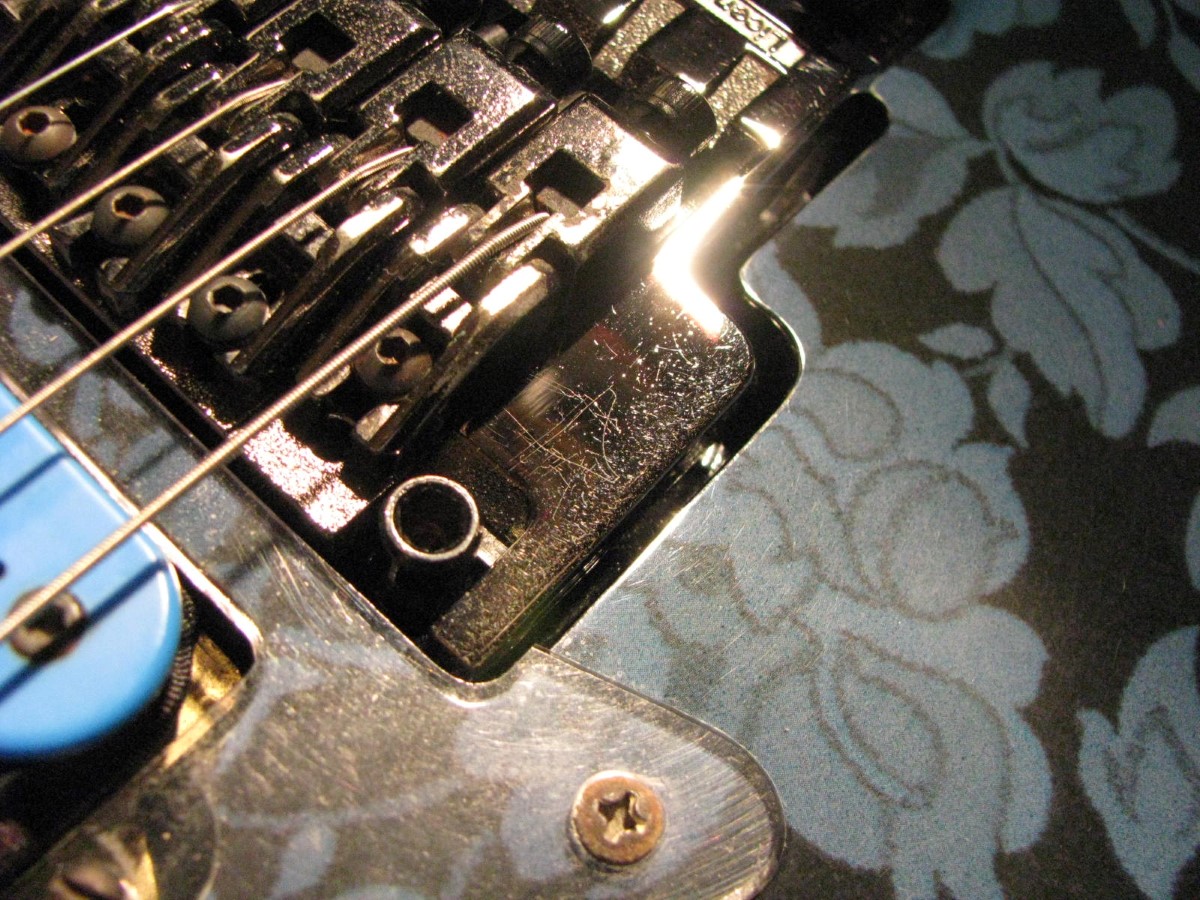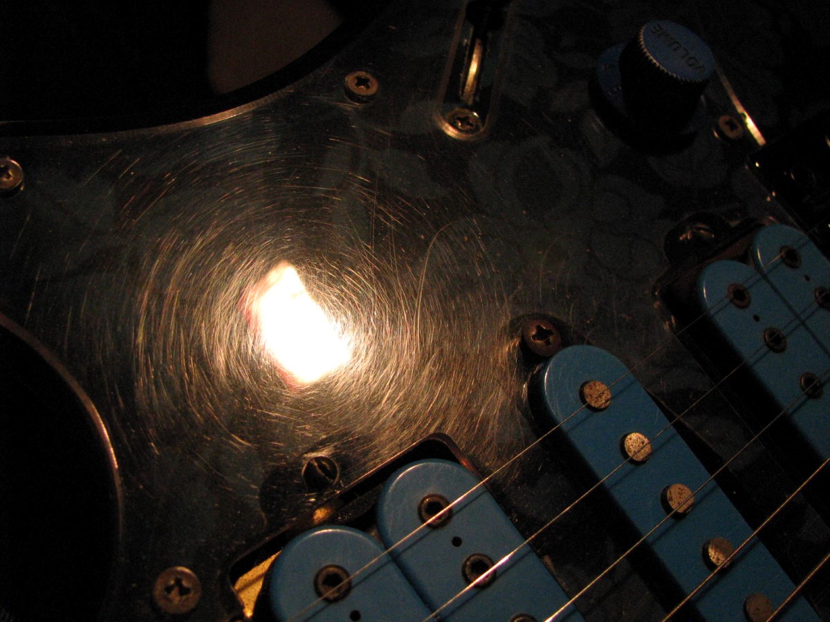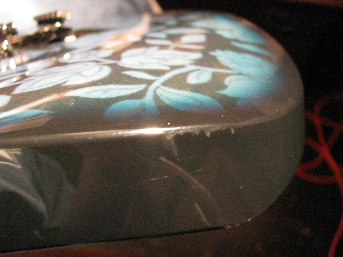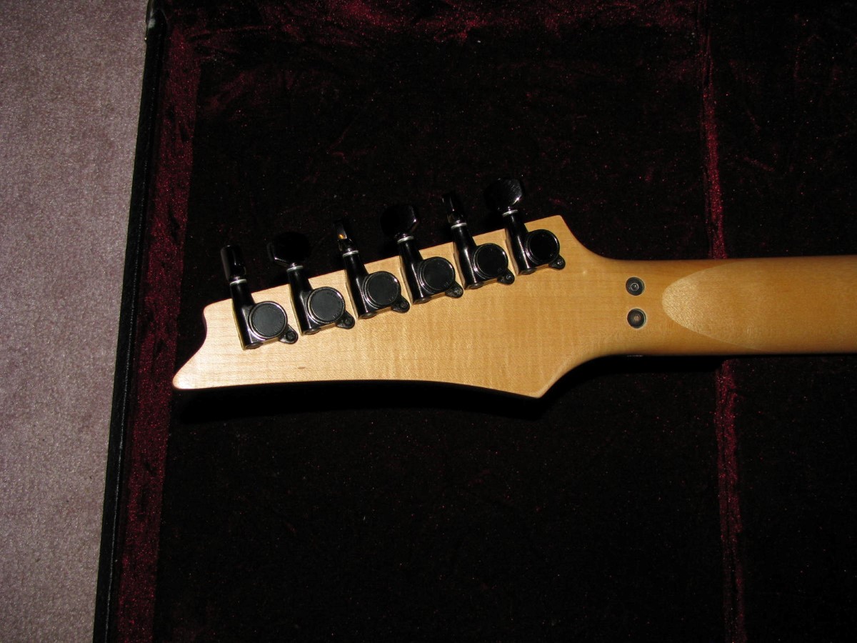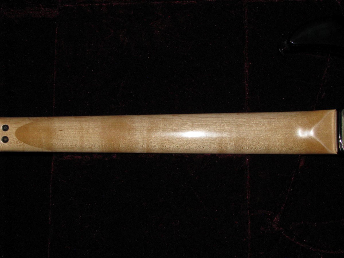 JEM77BFP - EXC, This BFP is rare in that it's still very much blue as the clear hasn't yellowed, which has given most of these green hues. It has been played so is showing lighter pick and fingernail scratching to the pickguard and wear to the top edge of the volume knob, the painted blue wearing thru to the white knob underneath which is common on played BFP's. There is a fine scratch cloudy area on the top trem corner of the pickguard and into the paint above probably from a bracelet, none of the scratching is deel and all very fine. There is a ding on the front bottom edge, and the bottom side has several scratches and finish cracks, with a scuff on the top front side edge at the arm contour. There are a few small fog spots in the middle of the back and several small marks and scratches scattered. The jack cover is a non original replacement and is like the trem cover from the DY, which probably actually goes on this guitar. The trem has some fine pimpling to the baseplate and a little cosmo wear off the high points of the low E saddle and small spot corrosion to the tops of the rest, the neck plate with crusty white corrosion and about 25% original finish. There is a little dirt in the fretboard and it has very mild and even fretwear. The headstock is very clean. The back of the neck has been cleaned and clearcoated and all the orange peel wetsanded down and polished, probably to somebody's preference, and is super slick as it is. It does have an S shape neck bass side so it will need a deep fret level to make this guitar into a good playing guitar. It's in a basically brand new 2000's burgundy lined UV1000 case with bar only.**$2200** **REDUCED!! $1850**