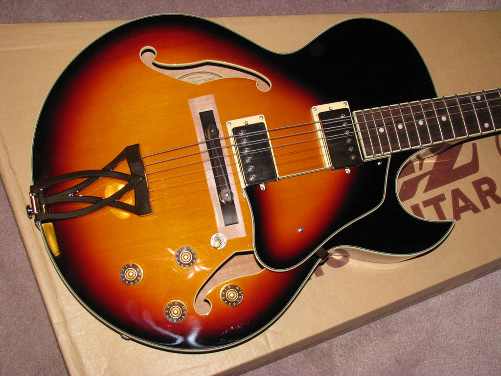 These are Euro model samples that were shipped to the US for 2009 NAMM. Hoshino sets them up in a private area to show to all the European dealers and Distributor buyers that come to Winter NAMM. It's basically a private NAMM show for the Europeans held behind the curtains. As samples used to entice orders, they typically choose the nicest available example, as with all NAMM show guitars. In fact some of these are built specifically as samples for the show. They are sold without Warranty, but have passed my strict inspection, are good guitars in every way, and are all between Near Dead Mint and Dead Mint untouched, factory condition. You are buying a Brand New guitar that may or may not have been picked up and looked at by a prospective dealer, not picked up and shredded by the normal crowd on the main floor floor. They are sold without Warranty, but at significant savings. Of course they include all tools, manual, and bar if trem equipped. These guitars are in their factory shipping boxes, are not cased, and no cases are available. This guitar will receive Bronze Level maintenance and setup before is ships. By serial number it is clear this was a purpose built show guitar. It is within 14 digits of several of the other show guitars, all very different models. ESTIMATED US LIST PRICE - $733.32 YOUR PRICE - $465 + Shipping. Pictures of the actual guitar below.