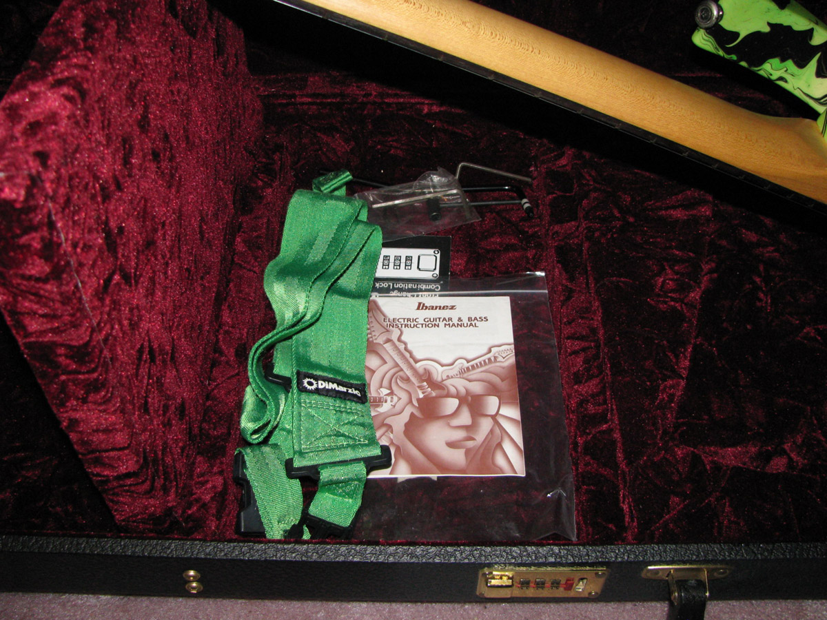 JEM77GMC - 915408 - Near Mint minus sweet busy lighter palette Green swirl. It was played and has a mildly scratchy pickguard and some light fretwear including the shallow 2nd fret dimple, on a beautiful dark rosewood slab. The paint and wood on this guitar is nearly pristine. There is a 5mm fog spot on the bottom front edge center of the waist, and a light quad scuff near the end of the headstock where it bounced/slid 4 times across it, and another almost at the tip on the bass side of the swoosh line. There are 100 tiny pimples on the baseplate and wear to the top of the E saddle, lots of corrosion to the neck plate, the strap pins with lots of cosmo wear, 1 1/2" NJFC bass side and 1/2" NJFC treble side of the neck pocket. It's in what would have been a brand new UV1000 ca. 1999-2013 [I'm sure there are slight variances if you had a large collection to test], with manual, tools, bar, and green cliplock [the dark later not the neon green]. Fred's GMC ALIEN PUKE identification tape next to the handle. These can be removed with GooGone and patience. Fred loved that the original owner had named it and kept it on the guitar.**$4750**