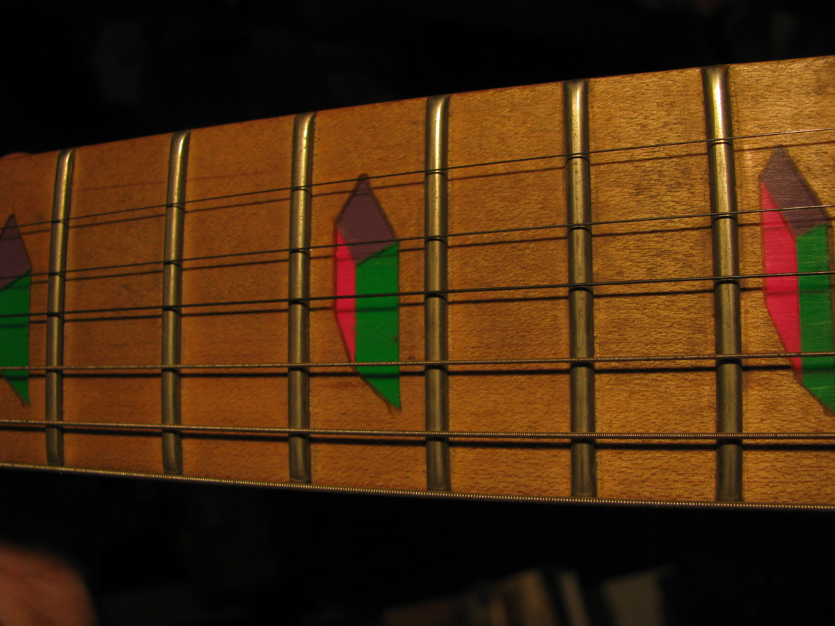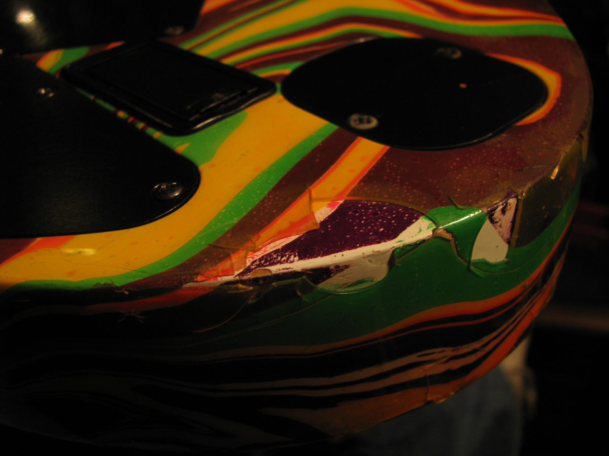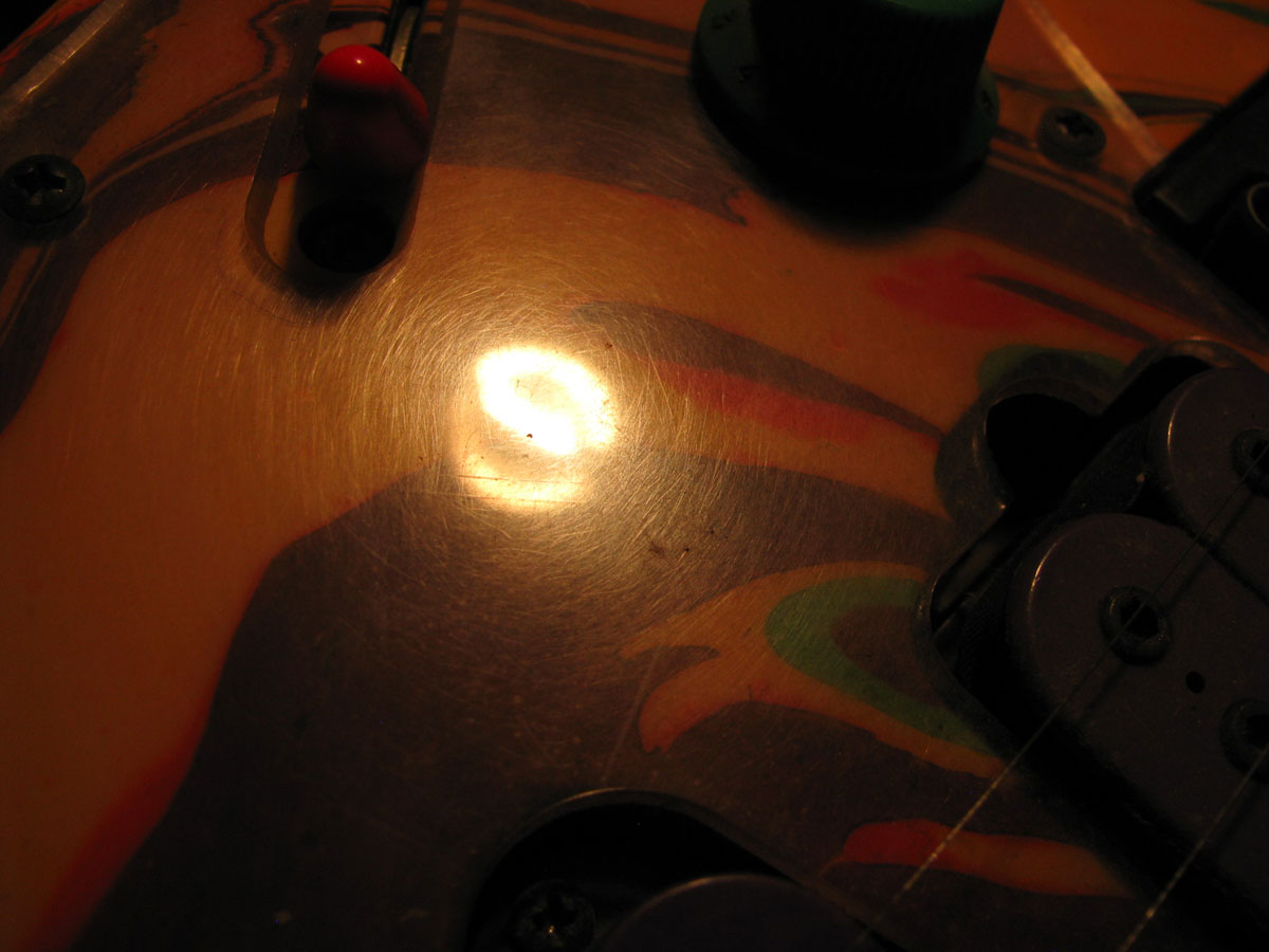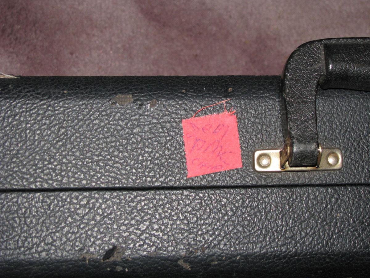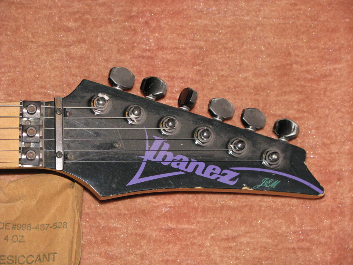 JEM777PMC - 916848 - One of the best PMC swirls you will ever see, without doubt. Great pattern, strong colors, and good balance is incredibly rare combination in PMC's. This guitar was played a lot, most likely gigged by a player also performing like Steve would, or, he was just very drunk. This guitar has so many chips, large losses, finish cracks, fog spots completely loose clear, the is just horrible. There isn't more than a few inch area where there isn't something. There will be plenty of condition pictures below, and note how amber the clear has turned in the close ups even though you don't notice it in the longer range. Every MC ambered like this but with these chipped guitars you can see how dramatic the original colors still are underneath the clouded and ambered clear. Long Neck Joint crack running bass side 1/2" around the back. It was played high as most of the rivet worming in on the trem anc con covers which have been worn nearly smooth. For a guitar played so much there is virtually no fretwear, and very little dirt in the fretboard that never did have a very thick coat of clear. Clean pink clip lock installed. It was also fitted with a battery box on the back for some reason, whatever was done it's been returned to "original" long ago, except there's a 223 cap on the volume and a 223 linked between the tone and volume knobs. I don't know why, I don't know what it does, I just know the 223 on the tone would normally be right side to center on the pot, and there should be a 331 cap on the volume. Of course the guitar is almost as dusty as it is bruised. I'm sure I never cleaned it when I sold it! All in all this guitar is a mess and in very natural relic condition, but - look at that swirl! It doesn't get any better than that in a PMC. There's no doubt it's in the superior class. Anybody that has one this nice that's clean, please get ahold of me, I've been looking for that perfect PMC to keep! This one is in it's correct and beautifully Salmon lined UV1000 that has as many gigging scars than the guitar, and it includes a very cool paperwork history, with complete warranty card, manual, the original hang tag when the guitar was sold new marked at $1549.99, with case, no store ID on the tag, but also an original www.ibanezrules.com "receipt book" receipt dated 9/24/01, number 273, that I had completely forgotten I ever used, from a 3 book order, this was the 27th from the last receipt I wrote before I realized WORD was easier and a whole lot cheaper! Rare Ibanez Rules memorabilia HA!, none of the other guitars I sold Fred had the receipts, he forgot to take this one out of the case. This PMC sold for $1600 plus $20 to ship, in 01. Complete tool set and the original strap pins, but no bar with this guitar. This guitar also has the later solid green knobs standard on later guitars. Fred's JEM PMC CHIP identification tape next to the handle. These can be removed with GooGone and patience. **$2850**