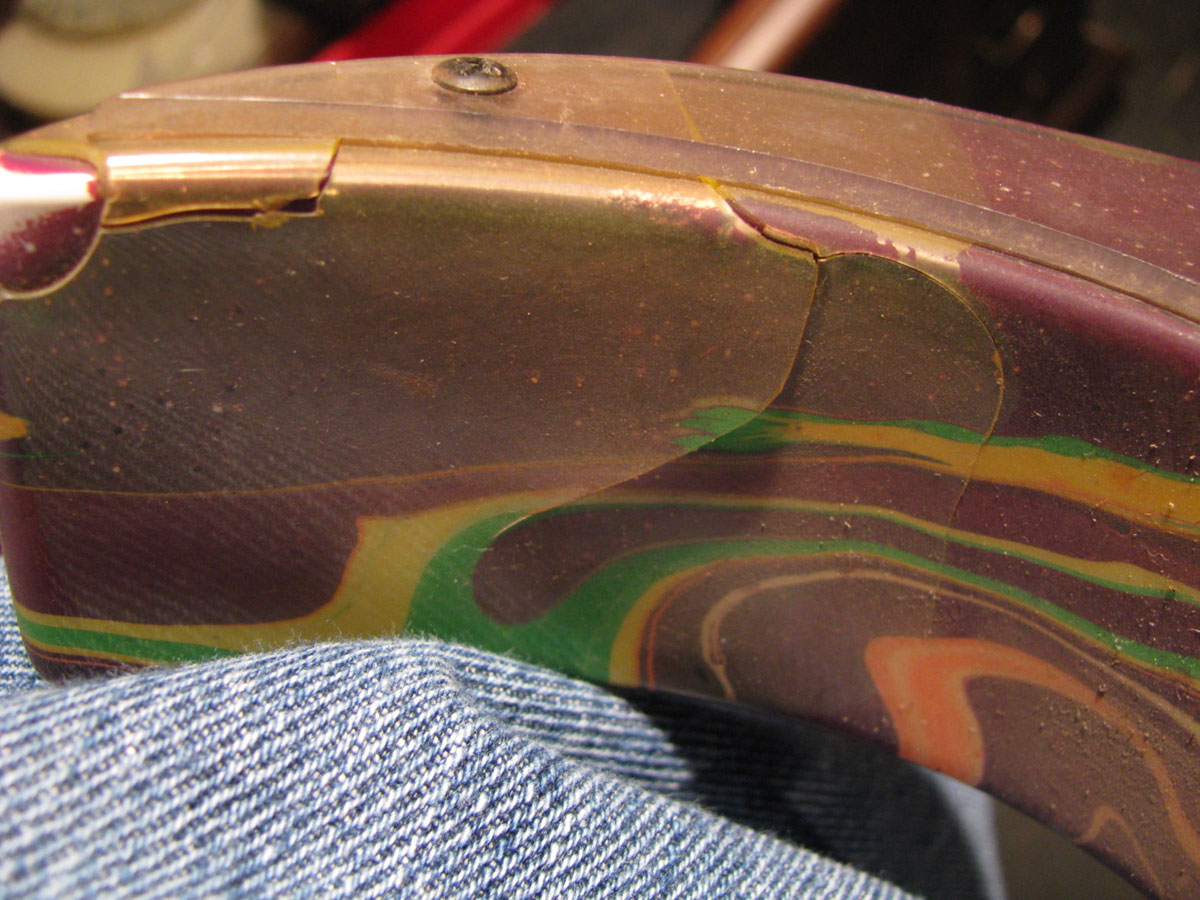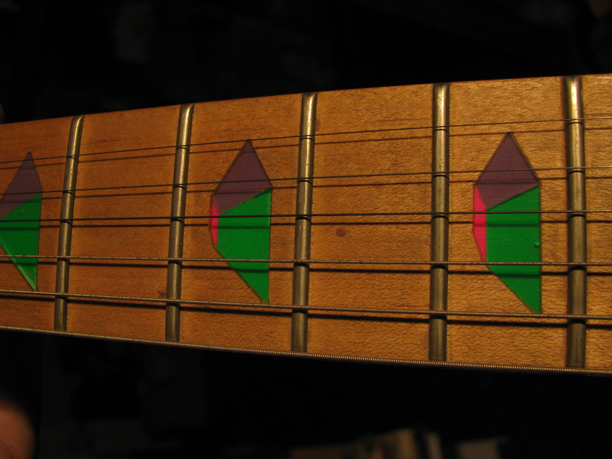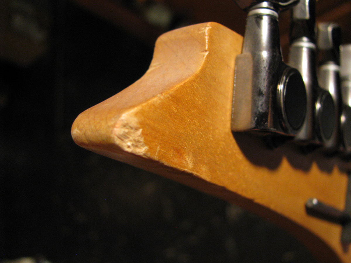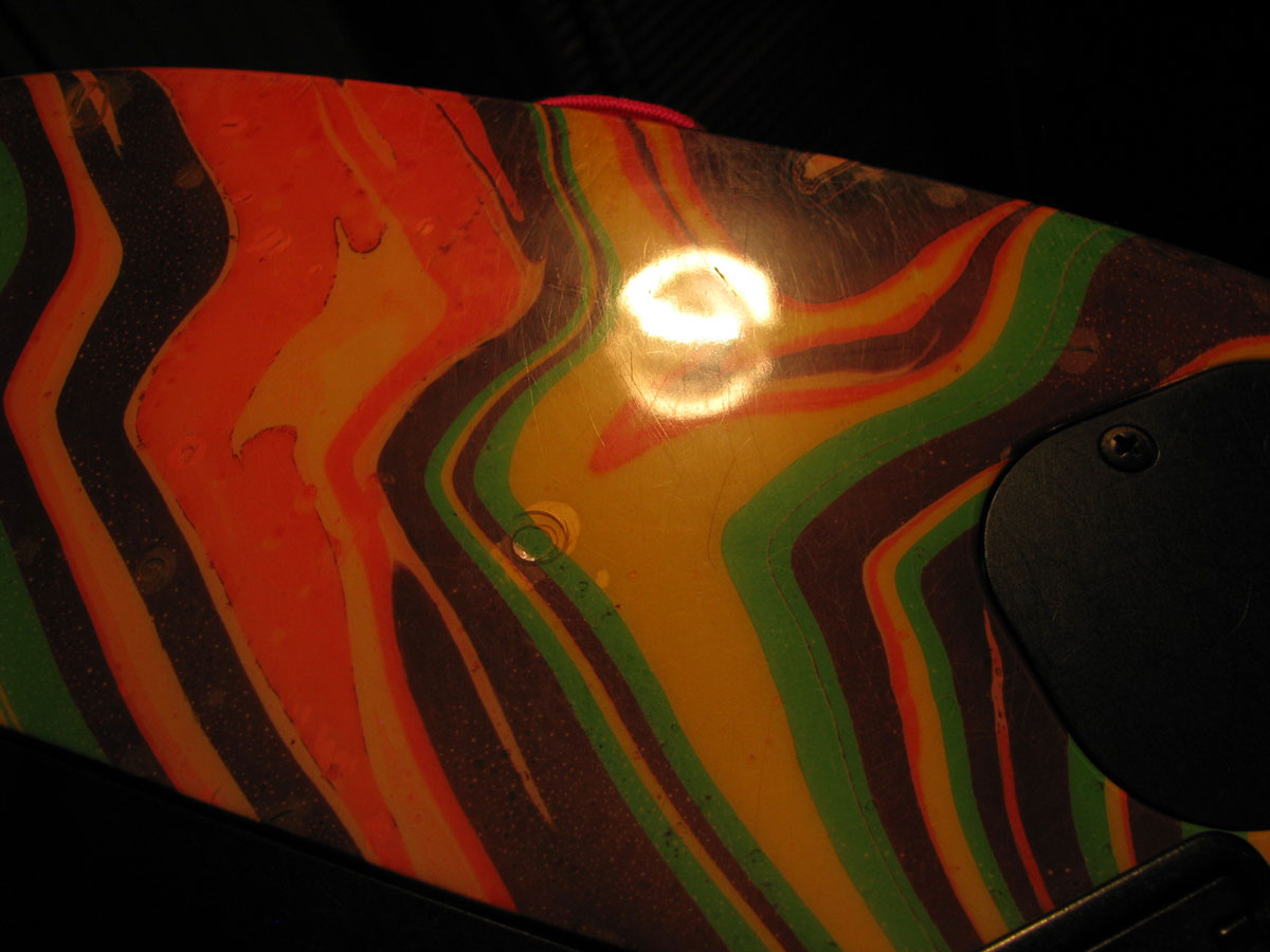 JEM777PMC - 916848 - One of the best PMC swirls you will ever see, without doubt. Great pattern, strong colors, and good balance is incredibly rare combination in PMC's. This guitar was played a lot, most likely gigged by a player also performing like Steve would, or, he was just very drunk. This guitar has so many chips, large losses, finish cracks, fog spots completely loose clear, the is just horrible. There isn't more than a few inch area where there isn't something. There will be plenty of condition pictures below, and note how amber the clear has turned in the close ups even though you don't notice it in the longer range. Every MC ambered like this but with these chipped guitars you can see how dramatic the original colors still are underneath the clouded and ambered clear. Long Neck Joint crack running bass side 1/2" around the back. It was played high as most of the rivet worming in on the trem anc con covers which have been worn nearly smooth. For a guitar played so much there is virtually no fretwear, and very little dirt in the fretboard that never did have a very thick coat of clear. Clean pink clip lock installed. It was also fitted with a battery box on the back for some reason, whatever was done it's been returned to "original" long ago, except there's a 223 cap on the volume and a 223 linked between the tone and volume knobs. I don't know why, I don't know what it does, I just know the 223 on the tone would normally be right side to center on the pot, and there should be a 331 cap on the volume. Of course the guitar is almost as dusty as it is bruised. I'm sure I never cleaned it when I sold it! All in all this guitar is a mess and in very natural relic condition, but - look at that swirl! It doesn't get any better than that in a PMC. There's no doubt it's in the superior class. Anybody that has one this nice that's clean, please get ahold of me, I've been looking for that perfect PMC to keep! This one is in it's correct and beautifully Salmon lined UV1000 that has as many gigging scars than the guitar, and it includes a very cool paperwork history, with complete warranty card, manual, the original hang tag when the guitar was sold new marked at $1549.99, with case, no store ID on the tag, but also an original www.ibanezrules.com "receipt book" receipt dated 9/24/01, number 273, that I had completely forgotten I ever used, from a 3 book order, this was the 27th from the last receipt I wrote before I realized WORD was easier and a whole lot cheaper! Rare Ibanez Rules memorabilia HA!, none of the other guitars I sold Fred had the receipts, he forgot to take this one out of the case. This PMC sold for $1600 plus $20 to ship, in 01. Complete tool set and the original strap pins, but no bar with this guitar. This guitar also has the later solid green knobs standard on later guitars. Fred's JEM PMC CHIP identification tape next to the handle. These can be removed with GooGone and patience. **$2850**