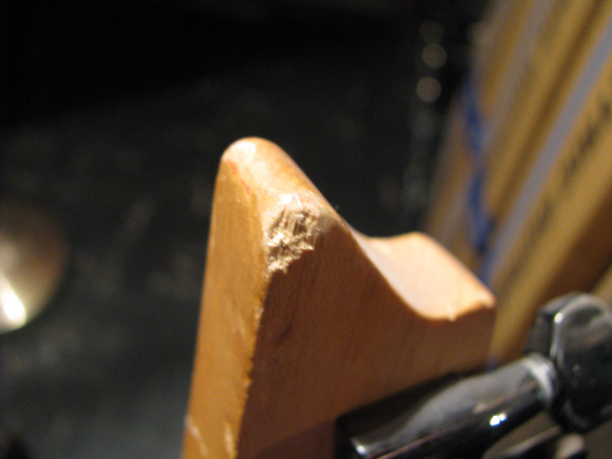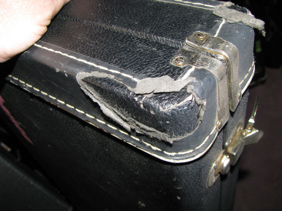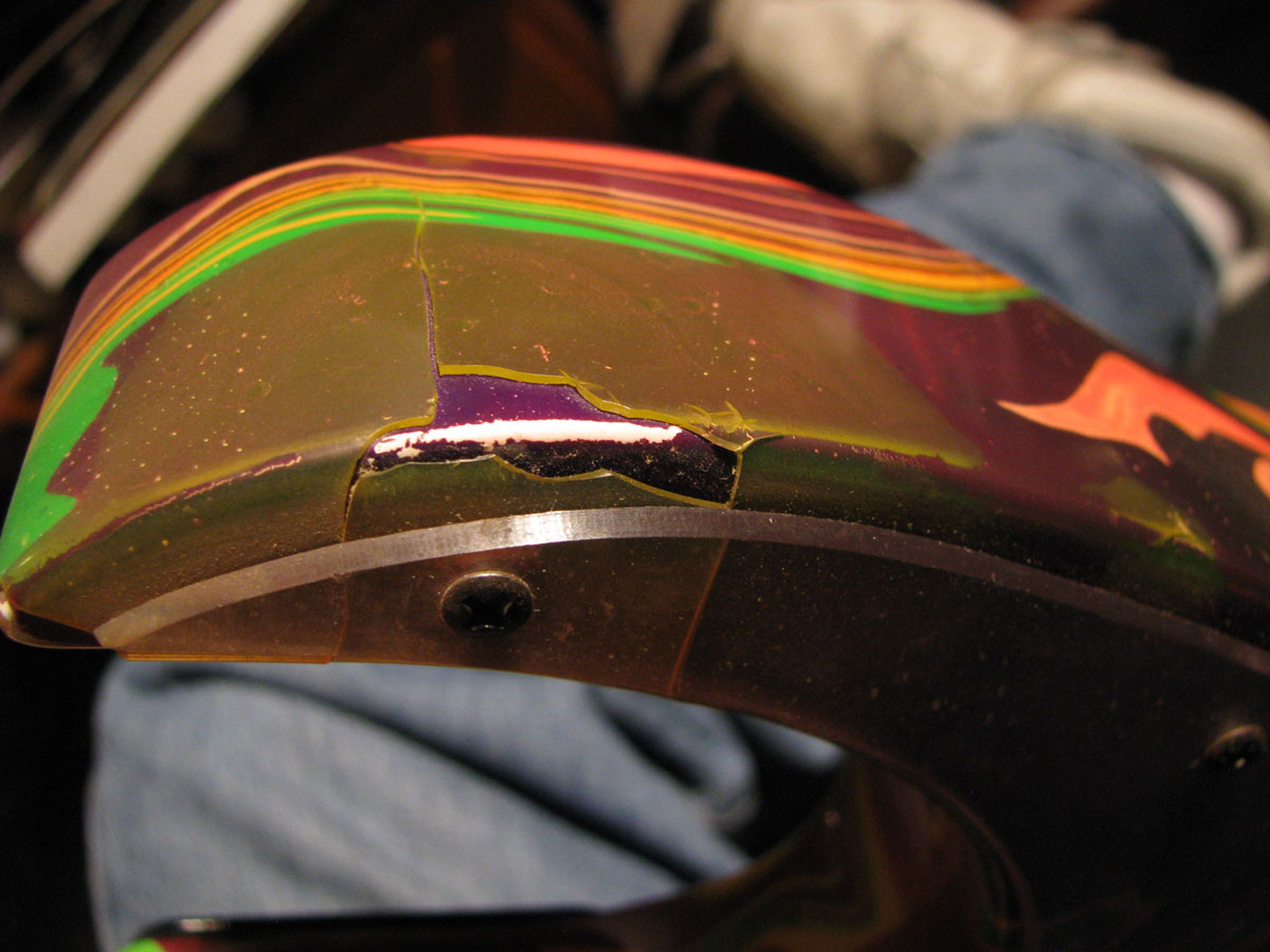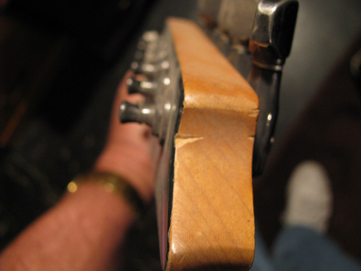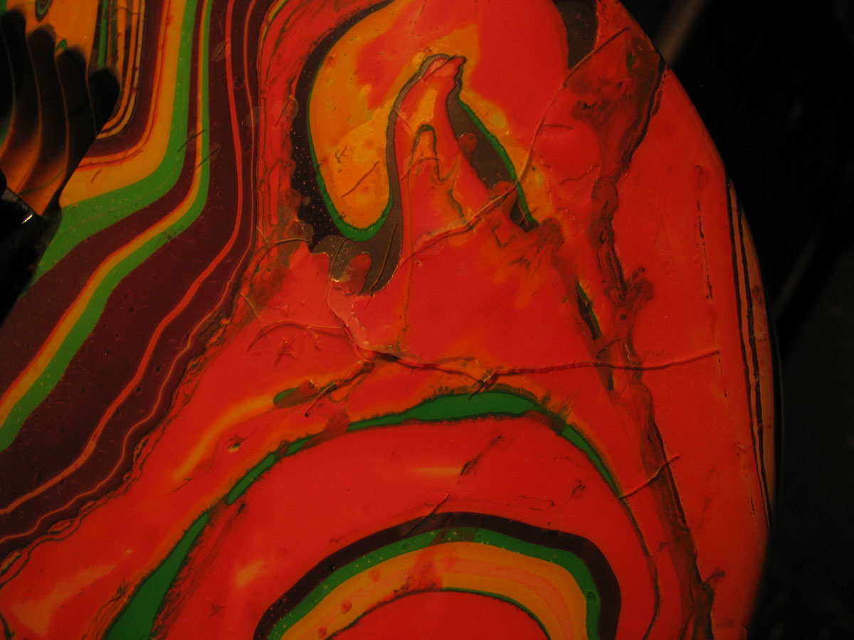 JEM777PMC - 916848 - One of the best PMC swirls you will ever see, without doubt. Great pattern, strong colors, and good balance is incredibly rare combination in PMC's. This guitar was played a lot, most likely gigged by a player also performing like Steve would, or, he was just very drunk. This guitar has so many chips, large losses, finish cracks, fog spots completely loose clear, the is just horrible. There isn't more than a few inch area where there isn't something. There will be plenty of condition pictures below, and note how amber the clear has turned in the close ups even though you don't notice it in the longer range. Every MC ambered like this but with these chipped guitars you can see how dramatic the original colors still are underneath the clouded and ambered clear. Long Neck Joint crack running bass side 1/2" around the back. It was played high as most of the rivet worming in on the trem anc con covers which have been worn nearly smooth. For a guitar played so much there is virtually no fretwear, and very little dirt in the fretboard that never did have a very thick coat of clear. Clean pink clip lock installed. It was also fitted with a battery box on the back for some reason, whatever was done it's been returned to "original" long ago, except there's a 223 cap on the volume and a 223 linked between the tone and volume knobs. I don't know why, I don't know what it does, I just know the 223 on the tone would normally be right side to center on the pot, and there should be a 331 cap on the volume. Of course the guitar is almost as dusty as it is bruised. I'm sure I never cleaned it when I sold it! All in all this guitar is a mess and in very natural relic condition, but - look at that swirl! It doesn't get any better than that in a PMC. There's no doubt it's in the superior class. Anybody that has one this nice that's clean, please get ahold of me, I've been looking for that perfect PMC to keep! This one is in it's correct and beautifully Salmon lined UV1000 that has as many gigging scars than the guitar, and it includes a very cool paperwork history, with complete warranty card, manual, the original hang tag when the guitar was sold new marked at $1549.99, with case, no store ID on the tag, but also an original www.ibanezrules.com "receipt book" receipt dated 9/24/01, number 273, that I had completely forgotten I ever used, from a 3 book order, this was the 27th from the last receipt I wrote before I realized WORD was easier and a whole lot cheaper! Rare Ibanez Rules memorabilia HA!, none of the other guitars I sold Fred had the receipts, he forgot to take this one out of the case. This PMC sold for $1600 plus $20 to ship, in 01. Complete tool set and the original strap pins, but no bar with this guitar. This guitar also has the later solid green knobs standard on later guitars. Fred's JEM PMC CHIP identification tape next to the handle. These can be removed with GooGone and patience. **$2850**