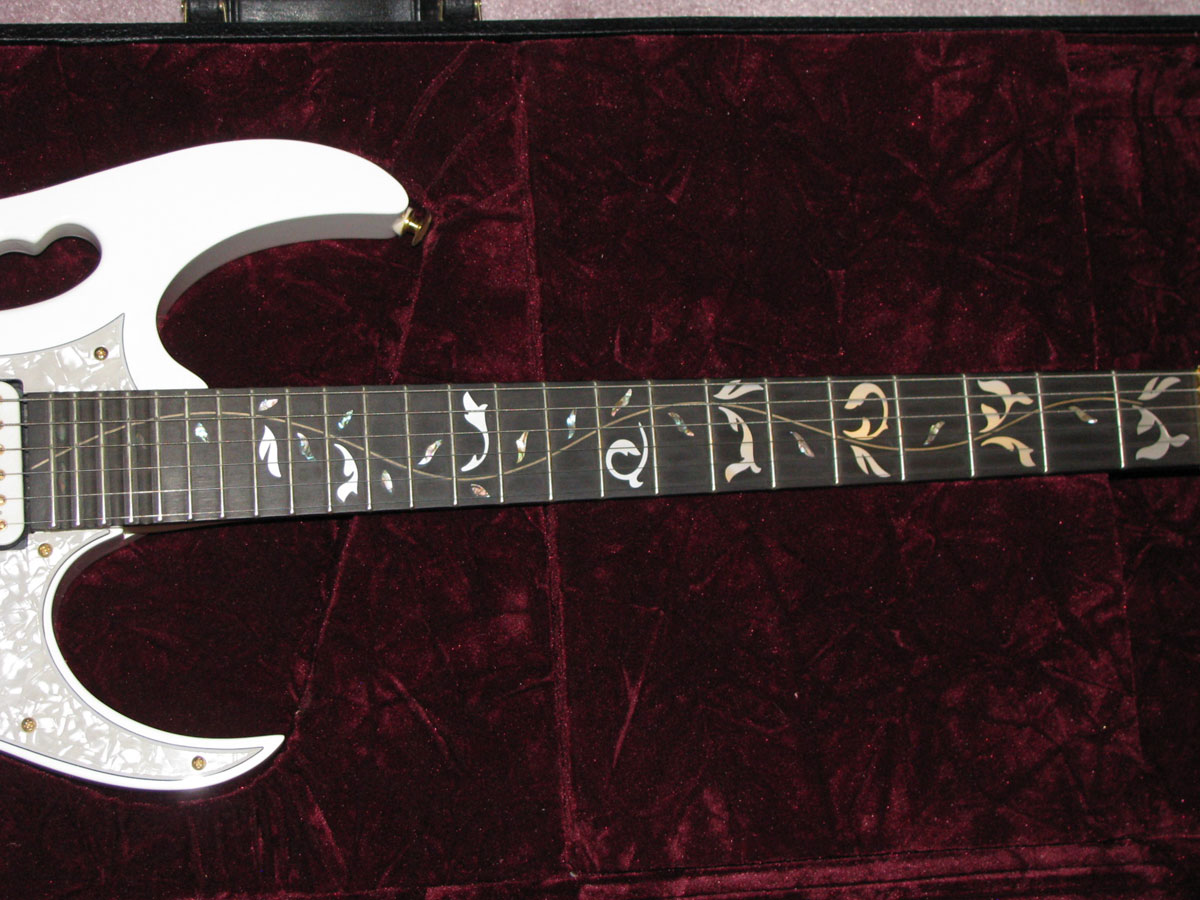 JEM7VWH - How could you not have a VWH in a JEM collection. 1998, ebony, Mint minus, it has light swirling scratches on the pickguard and a 1/2mm depression just off the guard toward the jack, and a little patch of button scratching in the belly cut just off the grip. Some slight scratching to the trem baseplate but extremely clean with no wear. No fretwear at all, this guitar was played, but very little. In very clean UV1000 but comes with bar only.**$1950**