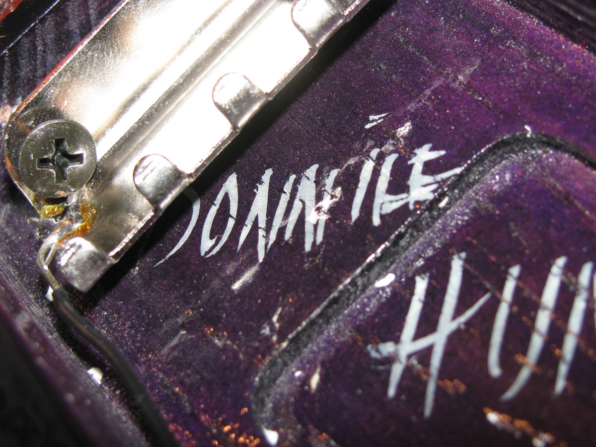 What is it? Is it a test body painted as a color palette sample? Donnie #3 shows nearly an exact match to the colors and there were several early guitars painted in reds that Joe has and were in promo shots. This very well have been one of the original samples painted by Donnie and it might very well be a mate to the catalog guitar, which you can tell was hurriedly finished with mismatched parts to get catalog shots and make the NAMM show deadline. It is quite possible this is the very first "Donnie" ever painted, there is no contesting it's very early in every detail. At this time period Radius bodies were used as necessary in the US for experimental and development work as we had stocks of them for H&S Bensalem to finish, and there is at least one Radius bodied JS2 that made it out as a finished guitar. Signed and dated where it should be, it's also signed and dated again in the trem cavity, which may or may not be in Donnie hand. It may, and I do believe it is, but "Donnie" is spelled wrong. Donnie did love to drink and would supposedly drink quite a lot while painting, so, I'm almost not surprised. This would be where Donnie would sign his earlier bodies, usually in a much larger size D Hunt, and also sign the number of the guitar. One look at the body grain and while I can't say exactly what it is it looks much more like alder or ash to me. It's a very heavy body at nearly 6 pounds for the body alone