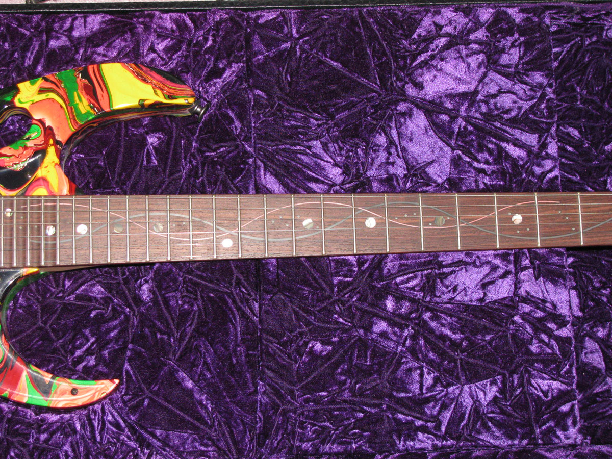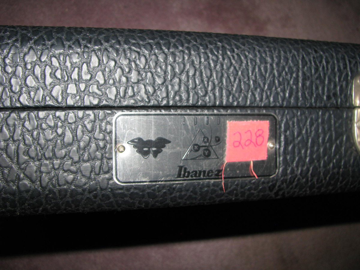 VAI2KDNA #228 - Near Dead Mint and a beautiful swirl with a sweet smoke streak running thru the trem. This guitar is untouched but somehow got a scratch in the back of the neck behind the 9th and 10th fret. About an inch long behind the 10th it curls, then skips, and picks up about 1/2" behind the 9th. The smoky residue on the face of the headstock that was present on every new DNA has never been disturbed. There isn't a single pick or fingernail scratch on the pickguard. The paint is flawless and exactly as it left the factory. I wiped the case evaporatives off the body as I was inspecting it to take the pictures. This is a Chesbro US guitar and the package is complete with all paperwork, tools, cert, sleeping bag, and in Near Dead Mint Chesbro US case that has 2 spots of wall scuff [white paint transfer] on one corner only. Identification number written on tape and put on the case plaque but it is on the protective plastic so to remove it just remove the plastic. Present the night of the group shot 228 is the third guitar down in the 5th row.**8750**