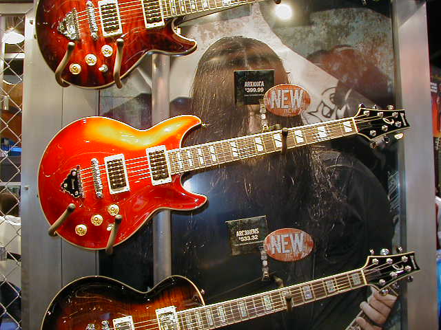 ARX300CRS - Ibanez introduces a new headstock design [unless I just plain missed it before] based on the original Artist headstock. ARX DX set neck, mahogany body with bound quilted maple top, medium frets, Gibraltar III bridge, ACH1 neck and ACH2 bridge pickups, available in CRS [Cherry Red Sunburst]. $533.32 List price. Case is the AR100C at $129.99.