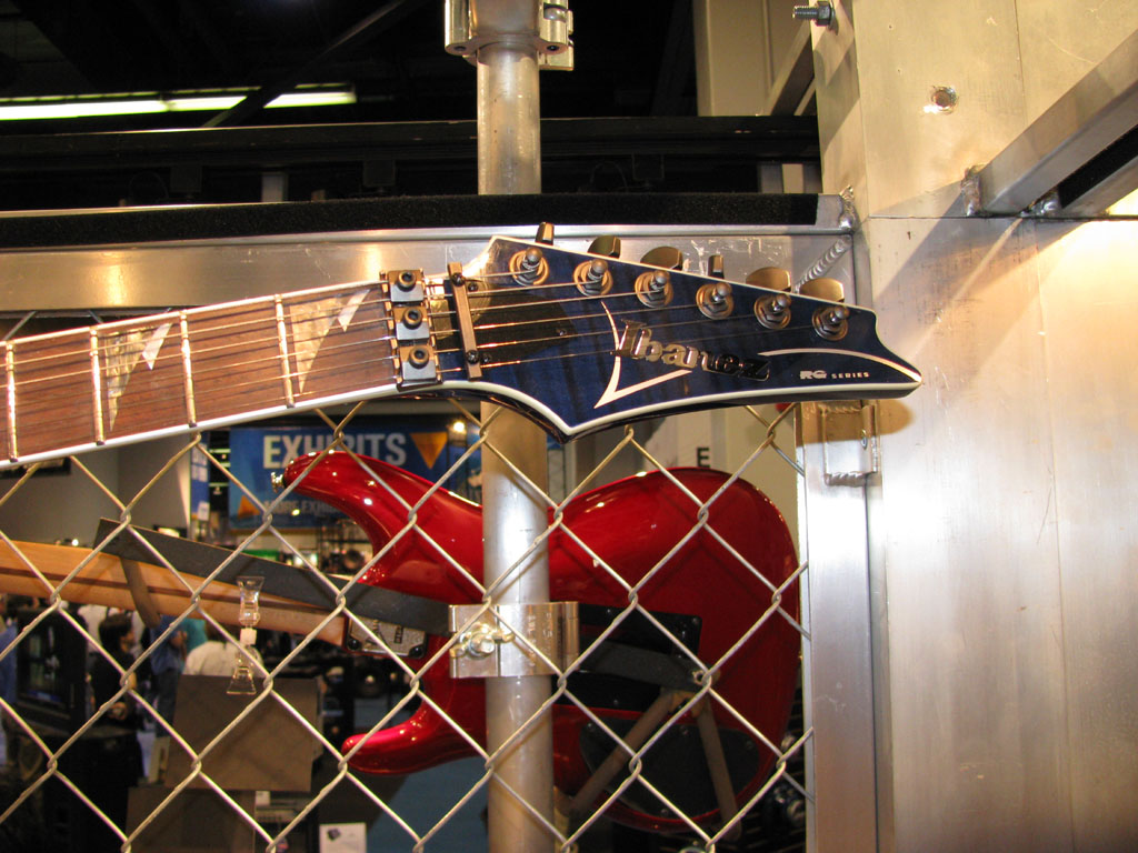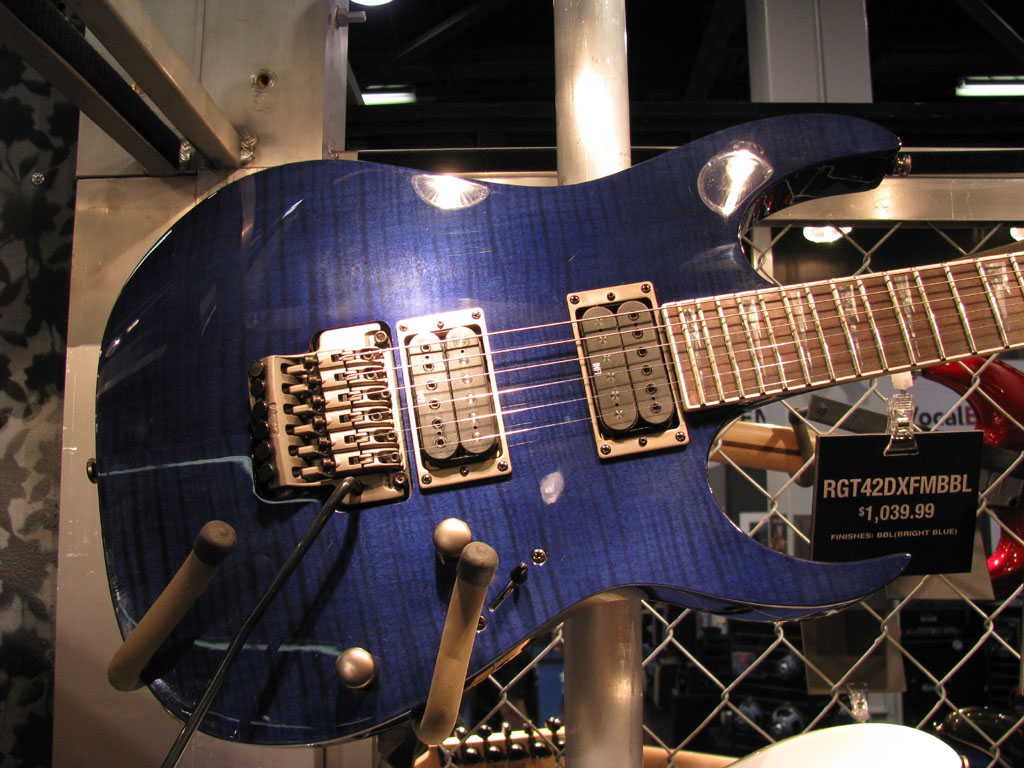 RGR420EXRAR - Reverse headstock 3 piece maple Wizard II neck with jumbos on a bound rosewood board, basswood body, EDGE III trem, IBZ V7 neck and V8 bridge pickups. Available in RAR [Red Arctic Frost shown here] and SAR [Silver Arctic Frost], and definitely the coolest paint in the Ibanez booth. $799.99 List price. Case is the RG140C at $109.99. Indonesian made.
