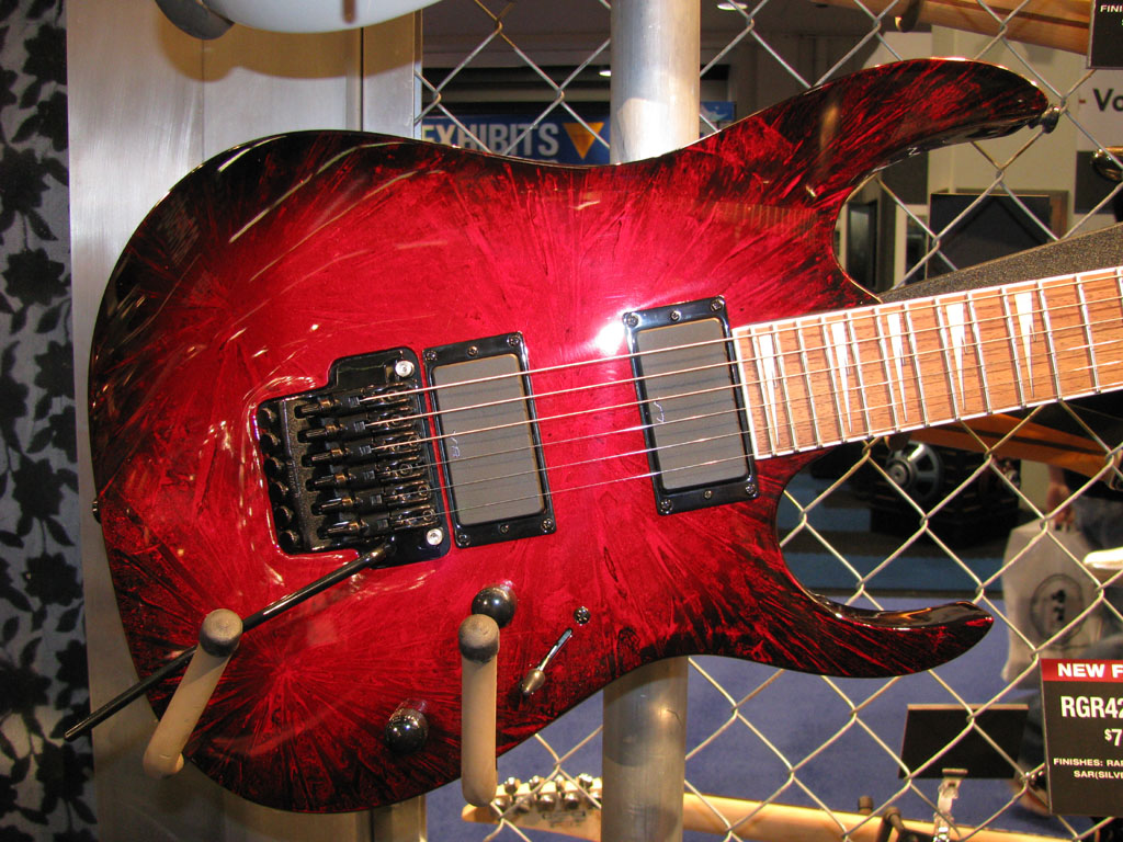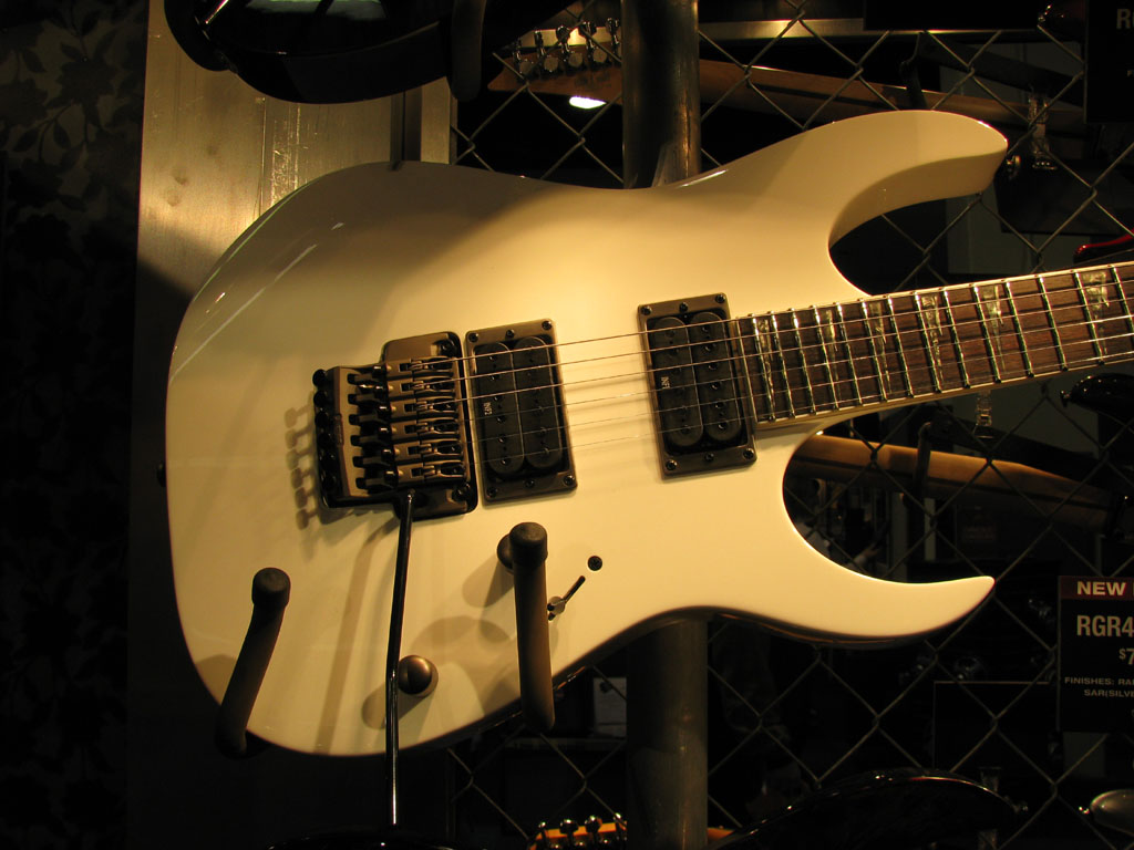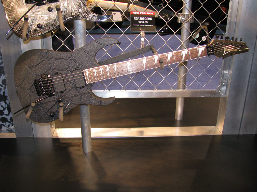 RG420EGSBK - 3 piece maple Wizard II neck with jumbos on a bound rosewood board, basswood body, EDGE III trem, IBZ V7 neck and V8 bridge pickups. Available in SBK [Spider Black] with the web routed into the body. $666.65 List price. Case is the RG140C at $109.99. Indonesian made.