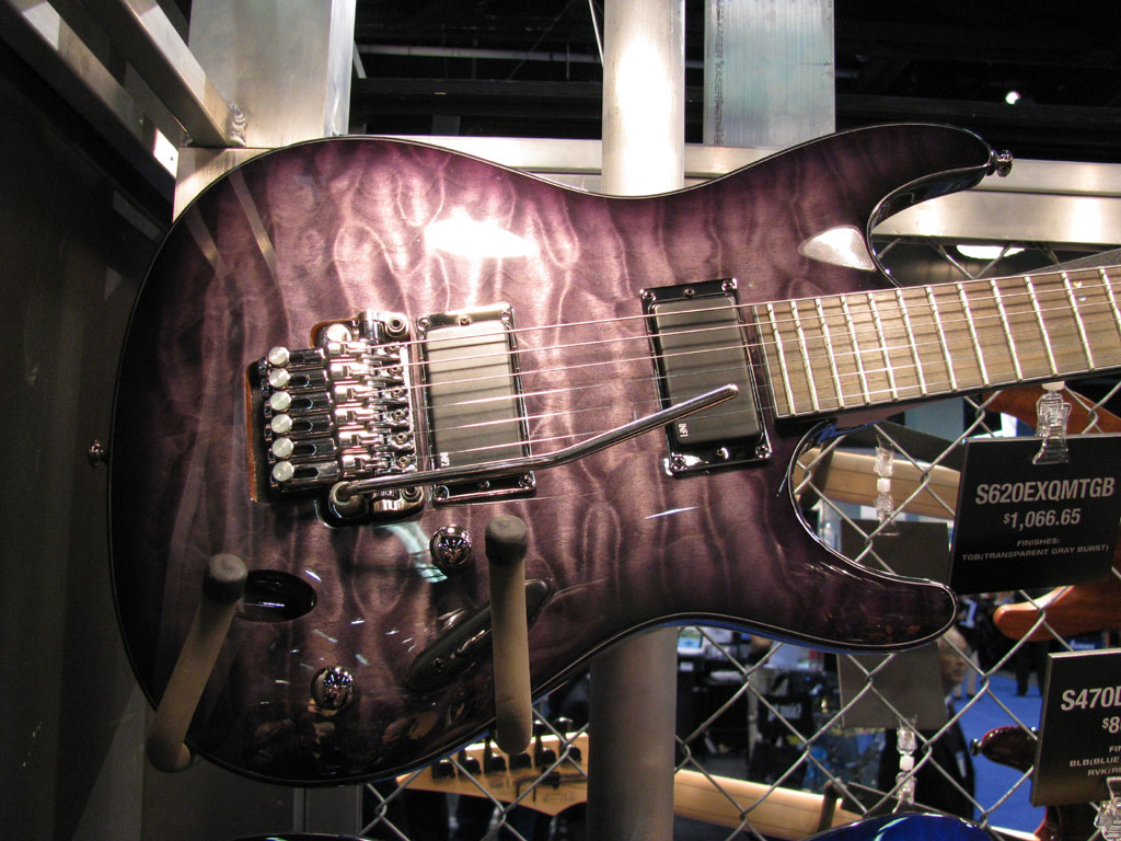 S S620EXQMTGB - 3 piece Wizard II neck with jumbos on a rosewood board, mahogany body with Quilted Maple top, IBZ designed by EMG pickups, ZR bridge. Available in TGB [Transparent Gray Burst]. $1066.65 List price. Case is the M100C at $139.99. Korean built.