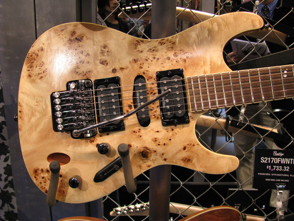 S2170FWNTF - 5 piece maple/bubinga Wizard II neck with jumbos on a bound rosewood board, mahogany body with Poplar Burl top, Dimarzio IBZ pickups, ZR bridge. Available in NTF [Natural Flat]. $1733.32 List price includes case. Korean built.