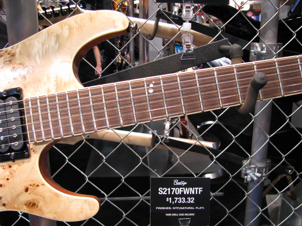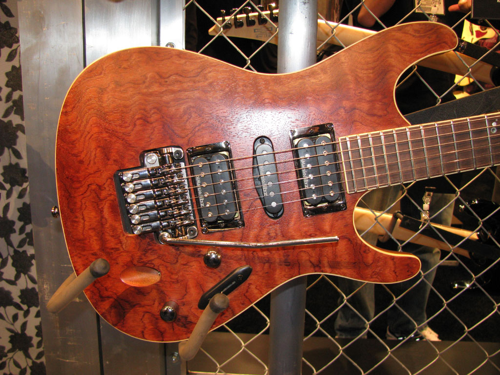 S2170FBNTF - 5 piece maple/bubinga Wizard II neck with jumbos on a bound rosewood board, mahogany body with figured Bubinga top, Dimarzio IBZ pickups, ZR bridge. Available in NTF [Natural Flat]. $1733.32 List price includes case. Korean built.