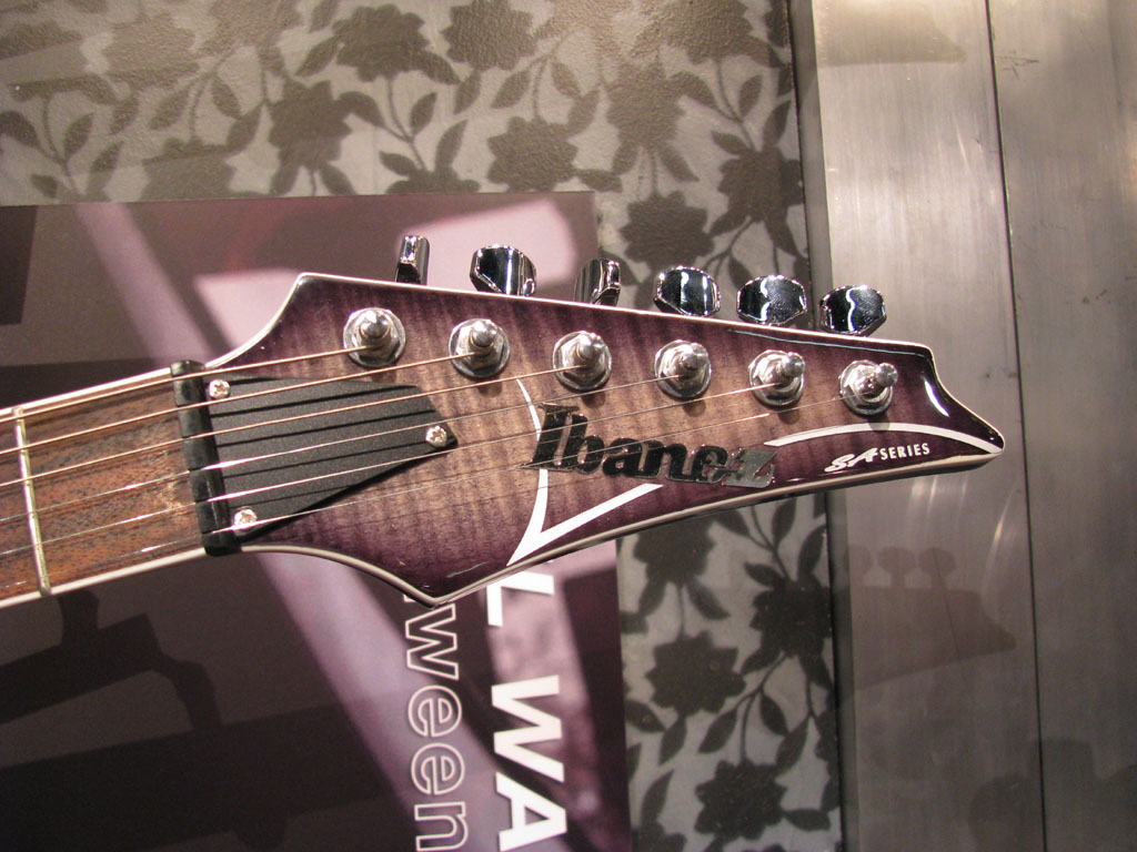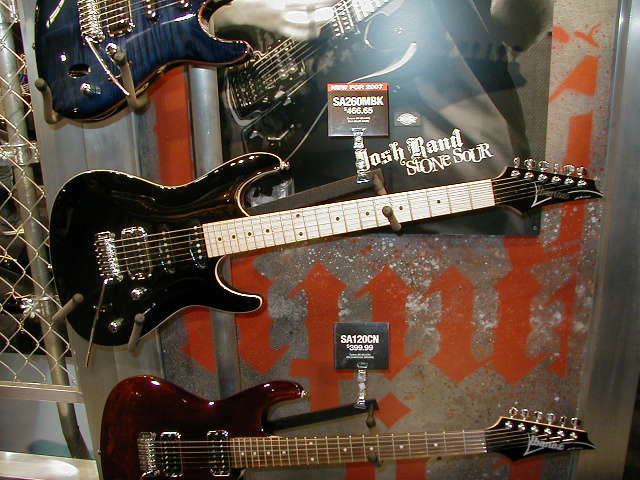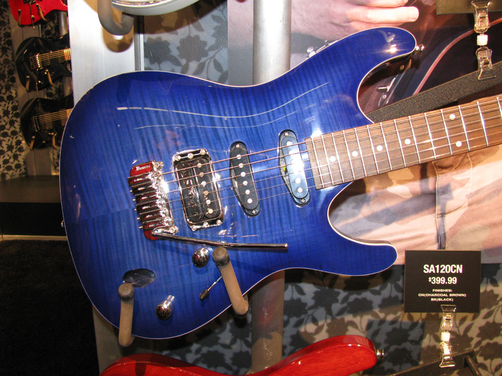 SA260MBK - These were not shown this year but are still in the catalog. Pics are from last year. 3 piece SA neck, mahogany body, medium frets on a maple board, SAT Pro bridge, IBZ AHS1 neck, IBZ AHS2 mid, and IBZ True-Duo bridge pickups, available in BK [Black shown here], and BLH [Blue Haze not shown]. $466.65 List price. Case is the M100C at $139.99.