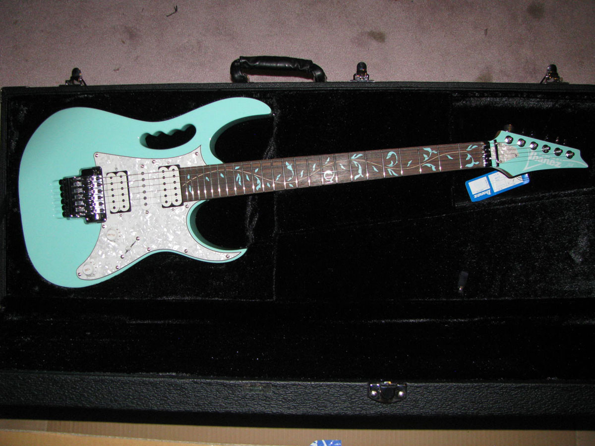 JEM70SFG - D0176D - SECOND STOCK - Description tag is missing so after a thorough inspection I counted about 10 of those tiny blue pen touch spots scattered around the body, none of which are significant in any way. But there is a small chip on the edge of one of the neck screw holes which is easy to fault. Otherwise typical Premium, fret alignment off a bit to the treble side, the corners of the trem making contact with the pickguard and the guard will have to be trimmed back to free it. S lightly double stamped on the back of the head. Like most Premiums it will get a hair shaved off the tips of the frets from minimal neck shrinkage. All Second Stock guitars come with 1 year Ibanez Rules Platinum Warranty.** $950 AS IS, $1075 Bronze Package, or $1225 Silver**