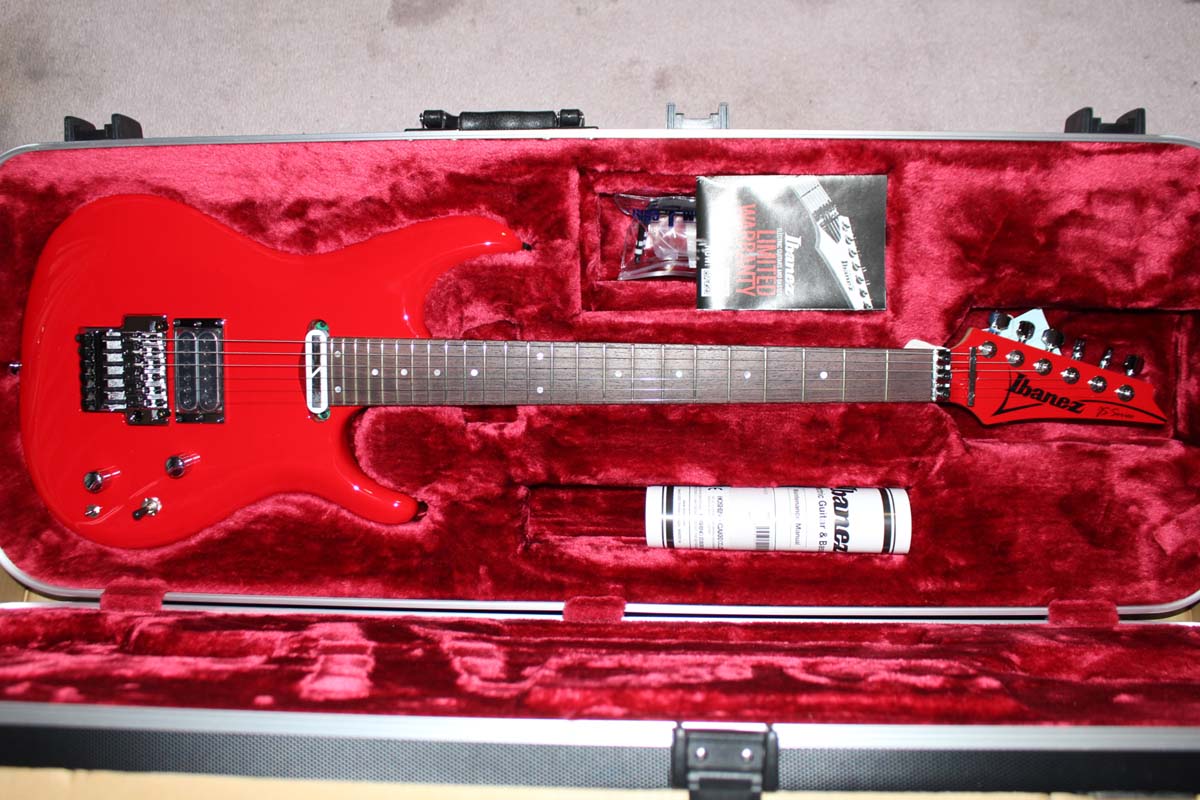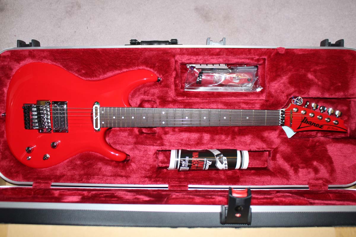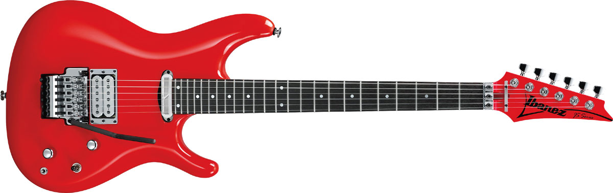 JS2480MCR - WITH SUSTAINER! Yes, Ibanez has finally released the guitar the way Joe actually plays it live. This guitar reverts back to basswood. It continues the Muscle car color scheme now in Red, but the real news is the sustainer. It also includes a new bridge pickup, the Satchur8.