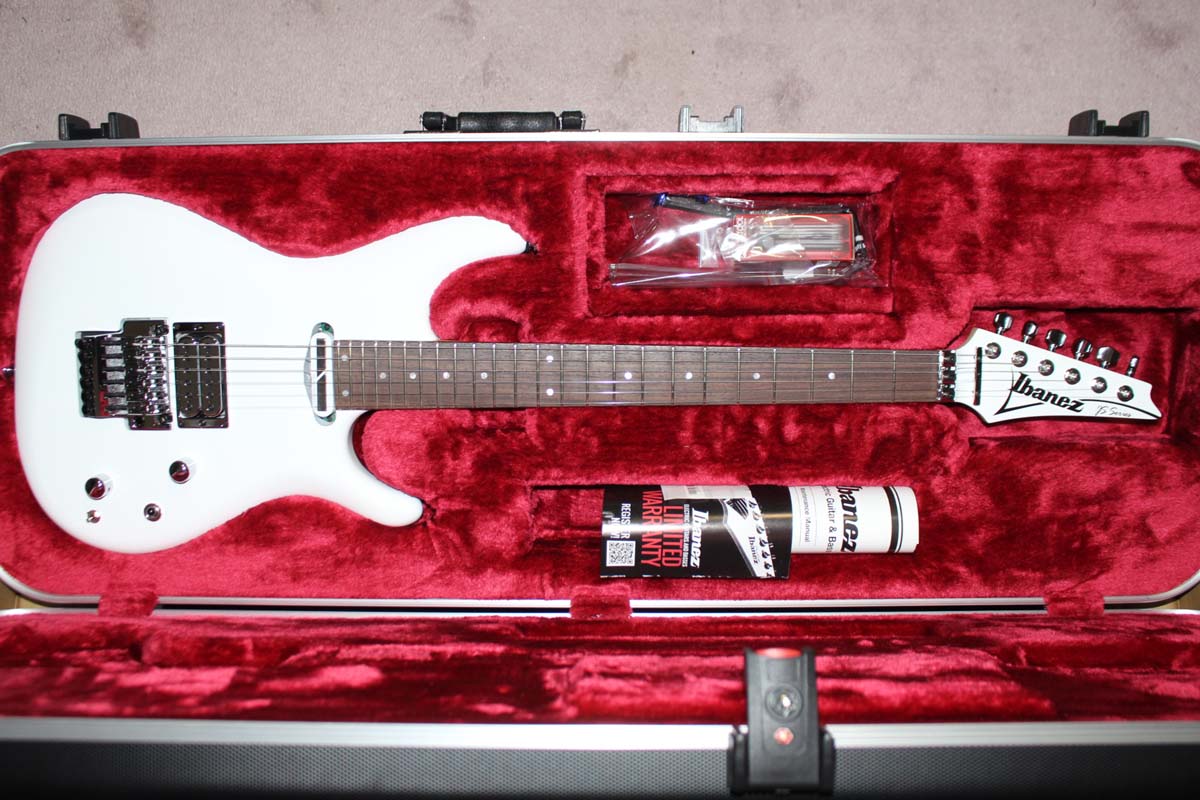 JS2480WH - New color - WITH SUSTAINER! Yes, Ibanez has finally released the guitar the way Joe actually plays it live. This guitar reverts back to basswood. It continues the Muscle car color scheme now in Red, but the real news is the sustainer. It also includes a new bridge pickup, the Satchur8.