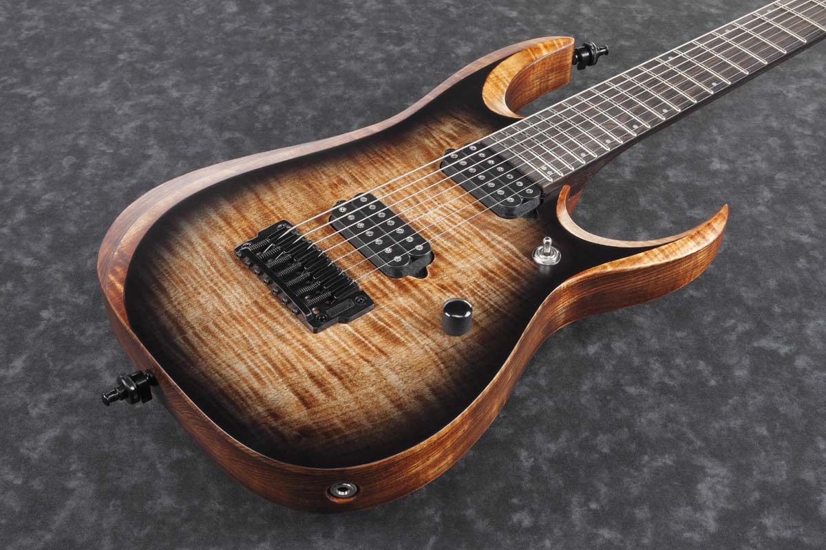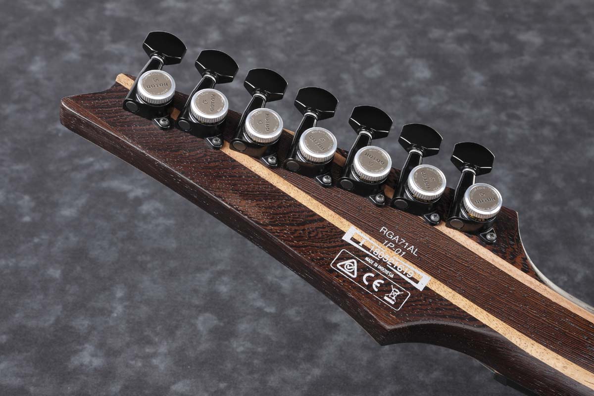 The RGD71AL features a thick 4mm Flamed Maple top on Ash body. The Macassar Ebony fretboard provides a snappier sound, and the extremely rigid, super-thin and ultra-playable Nitro Wizard 5-piece Panga Panga/Walnut neck substantially increases sustain. The Sub Zero treated frets can stand up against the hardest riffing and string-bending. The luminescent side dot inlays make it easy for players to perform on dark stages and match the dazzling luminescent Ibanez headstock logo. The RGD71AL is loaded with DiMarzio® Fusion Edge pickups, the amazing product of a collaboration between DiMarzio® and Ibanez. DiMarzio® Fusion Edge pickups provide great clarity and a very smooth response. The Gibraltar Standard II enables the optimal transfer of each string’s vibration. The Gotoh® locking tuners provide tuning accuracy and allow for quick, efficient string changing and the Schaller S-Lock strap lock pins hold a strap securely but make it easy to put the strap on and take off quickly.