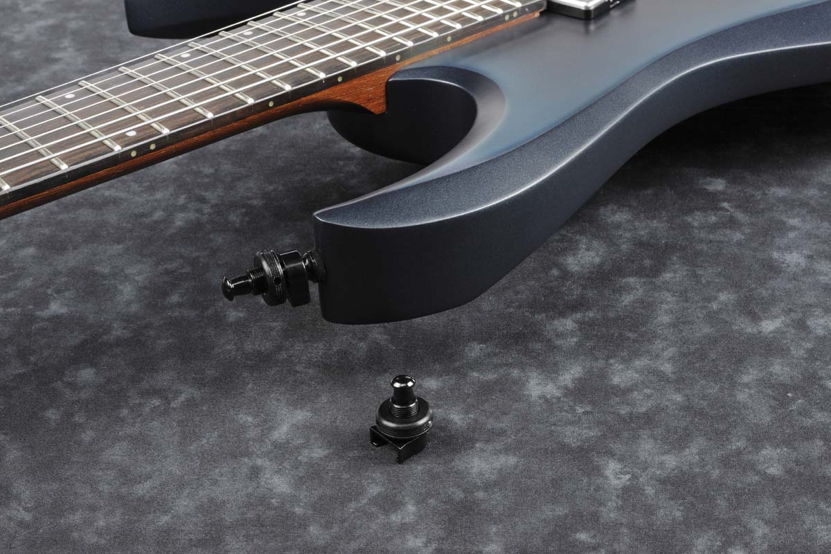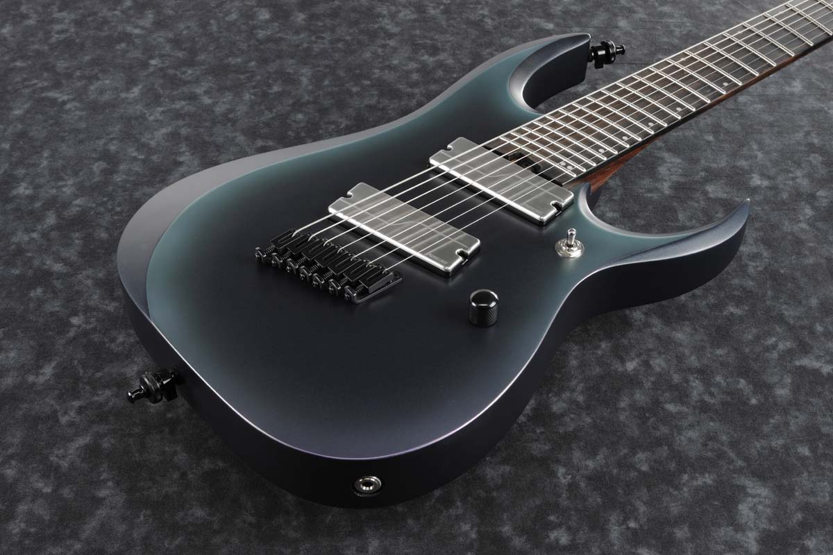 The RGD71ALMS’s 27”/25.5” multi scale provides an individual string tension to create a more “open” or “alive” tone that not only expands harmonic complexity, but also offers a more comfortable playing experience. Designed for playability, the slanted frets are matched with the player’s hand angles to facilitate quick playing. Extra-deep cutaways grant comfortable access to the neck’s highest notes. The Macassar Ebony fretboard provides a tight low end with quick response and the extremely rigid, super-thin and ultra-playable Nitro Wizard 5-piece Panga Panga/Walnut neck substantially increases sustain. The Sub Zero treated frets can stand up against the hardest riffing and string-bending. The luminescent side dot inlays make it easy for players to perform on dark stages and match the dazzling luminescent Ibanez headstock logo. The Fishman Fluence Modern Humbucker pickups provide an aggressive tone and a powerful attack without excess noise. The Voicing switch allows the pickups to have a modern, active high output sound or a crisp, clean and fluid sound. Designed for both stability and sustain, the innovative Ibanez Mono-Rail bridge minimizes cross-talk between strings and facilitates flawless intonation. Gotoh® locking tuners provide tuning accuracy and allow for quick, efficient string changing and the Schaller S-Lock strap lock pins hold a strap securely but make it easy to put the strap on and take off quickly.