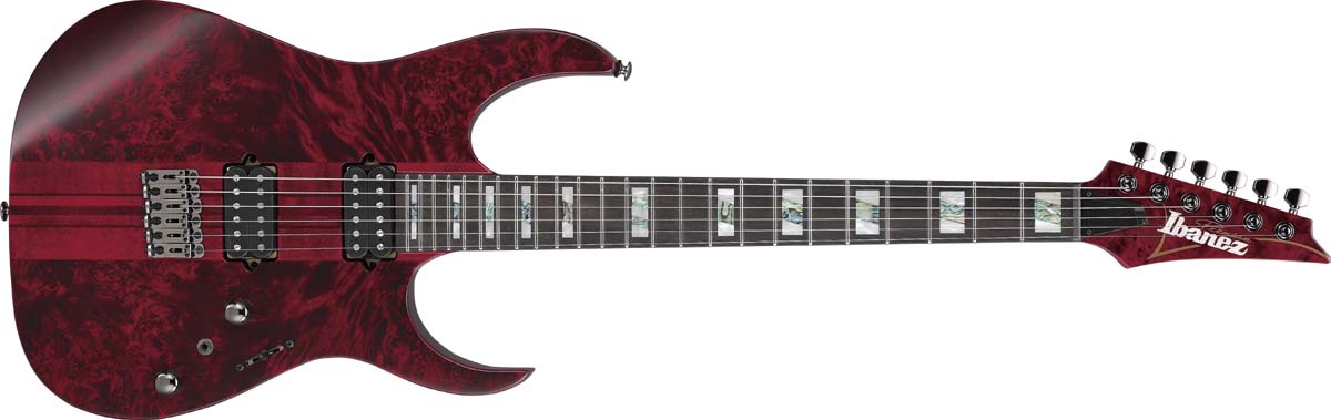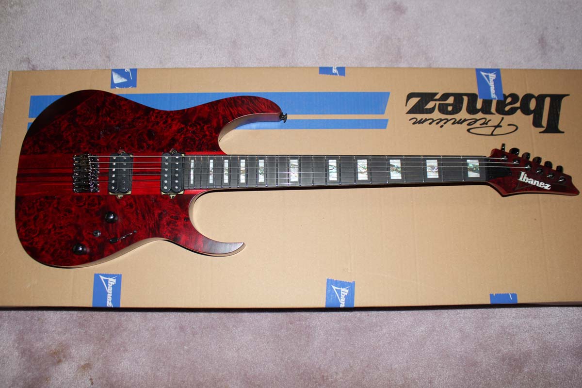 RGT1221PBSWL_240616931 - Small brush on the back edge of the lower horn that thinned the red and shows a couple small spots of wood color, before it was cleared, typical, Ibanez doesn't consider them "flaws", they won't even discount them, but it's not enough to reject because technically this guitar is uncommonly too good for Indo, perfect string alignment, perfect neck relief profile, pure black ebony, great burl top. It's a best of the best. If it was perfect it would be a unicorn.