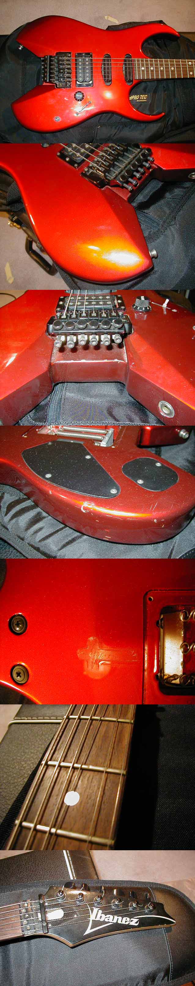 RBM2NT - Player condition would be generous, but beater might be a little too harsh. There are numerous dings and worm trails, 2 extra screws added to the face for some reason, it was used lefty for some time so both pins were moved, the top pin twice, to the AANJ and to the lower horn. There's gold corrosion under the pickguard, the micro switch has been replaced with [I guess] a tone pot and has a skull knob on it, the headstock logo is gone, serial number unreadable. The good points are the gold on the original edge trem is in very good condition and the fretwear is fairly mild. No case, no gig bag, nadda. AS IS, this was an ebay mistake and since there's no profit in it I can't put any time in it.** $1150** GONE** THANKS DAVID** 12/15/05