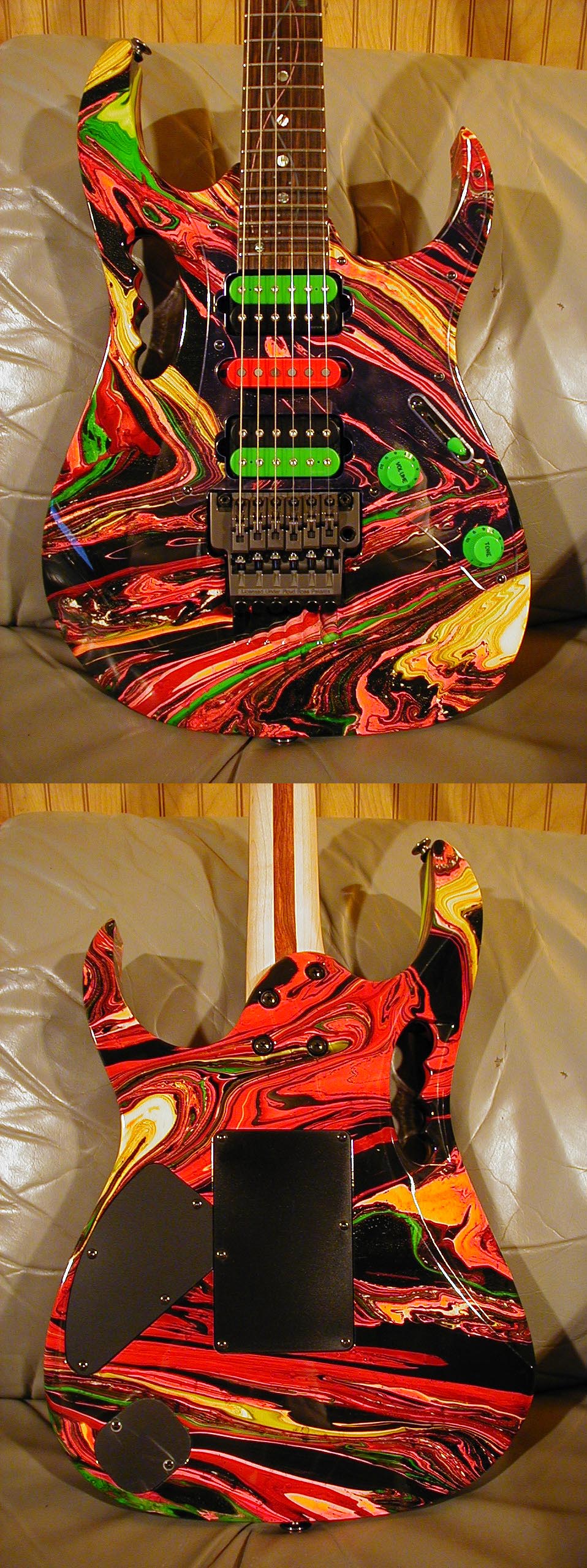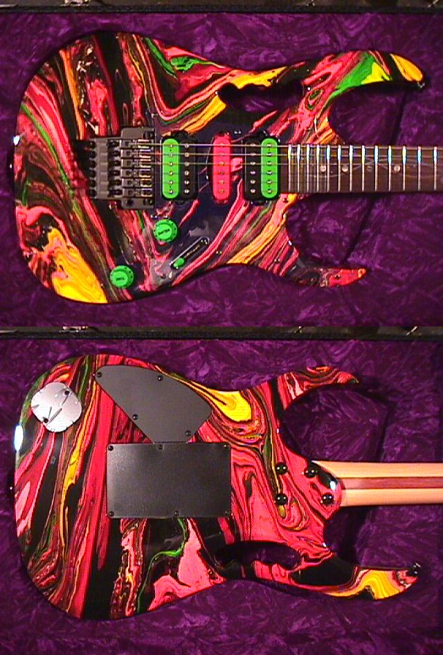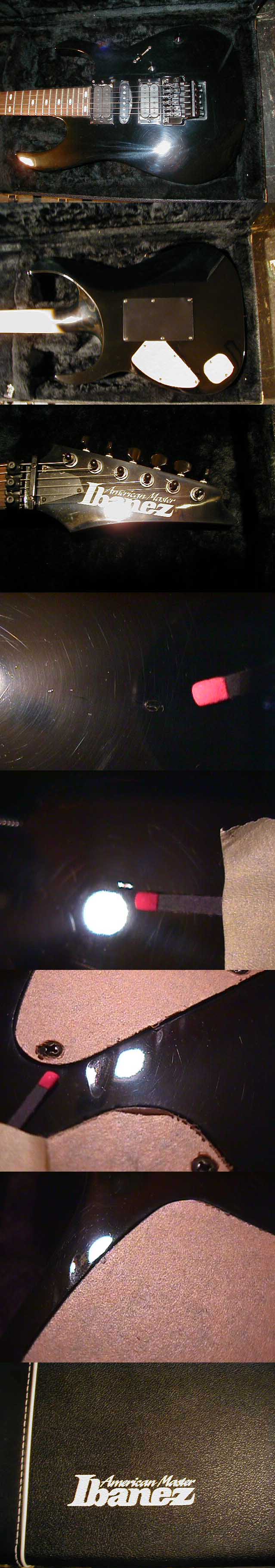 JEM77GMC - This was a great swirl when I sold it 3 years ago, but after 3 years in moron hands I'd have to grade it Fair. Repurchased on ebay from Anthony Barone of Long Island, NY, aka tonysta2s, obviously his Ridlyn prescription ran out and he neglected to refill it. Subjected to 3 years of atmosphere not meant for habitation, near 90% of all the cosmo finish has just vanished from the hardware. Whatever it was [and my personal guess is oil refinery combined with sea air and crack pipe] coated the whole guitar in a brown residue, which moron decided to sand and steel wool from the guitar. Back of the neck was sanded while on the guitar so there are scratches around the neck pocket, light mold now growing in the surface of the maple [possible Clorox would kill], residue "cleaned" from the face of the headstock, tops of the pickups, and pickguard with steel wool [I did say MORON owned right?]. There are no dings or chips in the guitar anywhere so it would be a good restoration candidate, but it's up for grabs *AS IS*. I don't have the time to spend on this travesty. Gallery pics the night before it was shipped, in better times. Uncased [just as it was sold]** $2250** JEM77GMC - Players condition GMC that I'd have to grade as Fair. Most of the chips are along the top edge and range from a few mm to about 1/2". Some have been touched up w/ black, most not. I count 7 on the top side/edge, 1 on the bottom side/edge, large fog spot on the lower front edge, 2 chips on the back bottom edge, and 1 next to the trem cover. Small edge chips on the headstock, pimpling to the base side of the trem and finish loss to the E A and D saddles. Minimal fretwear that will cut easily. In clean new UV1000.** $1875** JEM77GMC - Details coming